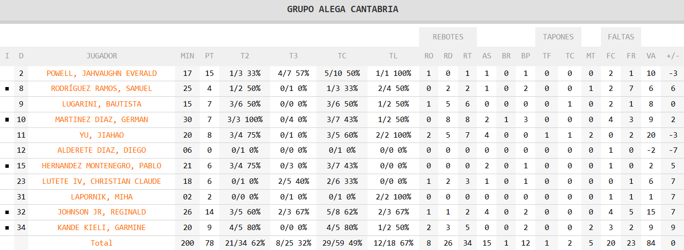 本场比赛,坎塔布里亚球员余嘉豪登场20分钟,投篮5中3,罚球2中2得到8分7篮板4助攻1盖帽。