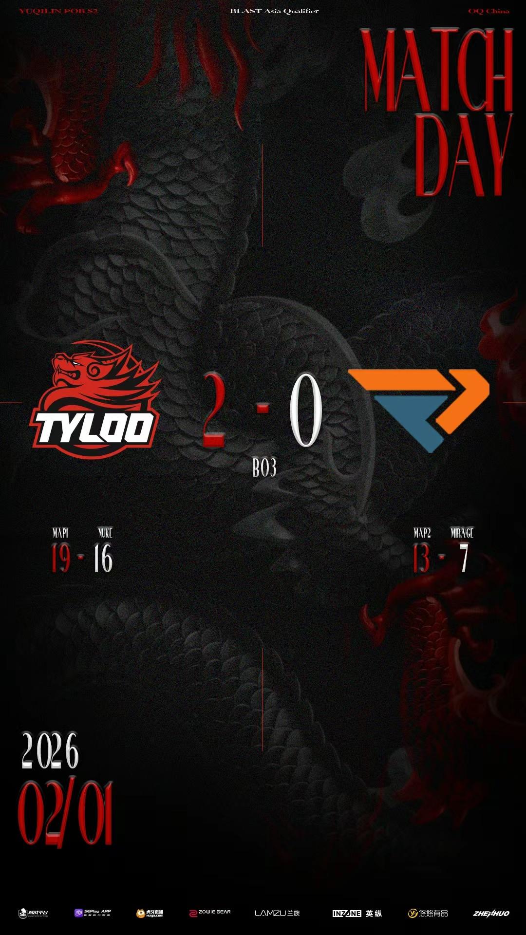 虎扑02月01日讯在今日下午结束的BLAST鹿特丹公开赛中国区公开海选赛决赛上,TYLOO在自选图Nuke双加时险胜后,2-0战胜RA青训FengDa战队,成功晋级亚洲区封闭预选赛。