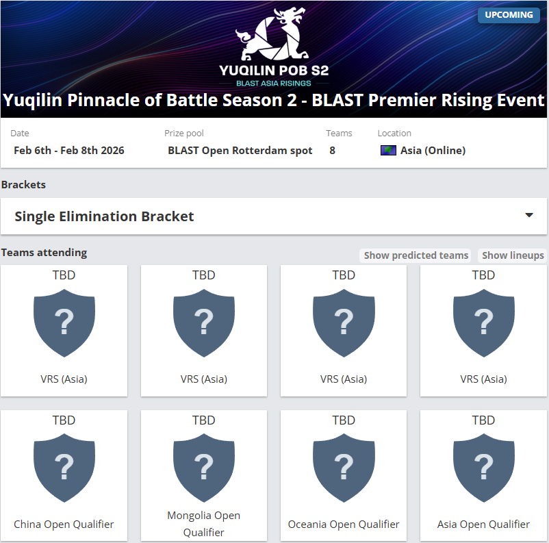 BLAST鹿特丹公开赛亚洲区封闭预选赛将于2月6日-8日进行,届时四支VRS亚洲排名直邀队伍,将与中国区、蒙古区、大洋洲区和亚洲其他地区公开海选赛出线的战队,共同在单败淘汰制BO3当中争夺唯一一个晋级名额。
