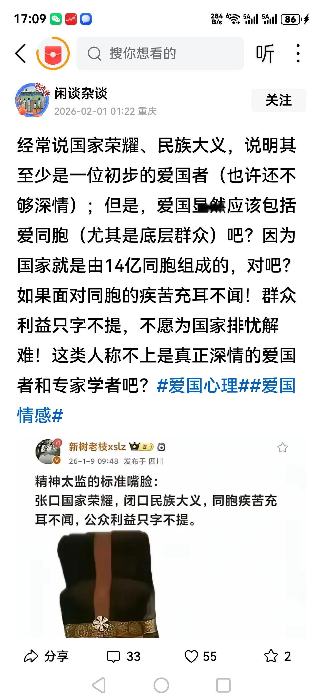 很多人是典型的思想殖民的受害者而不自知! "爱国"就要设定各种准入门槛,达不到门槛谈"爱国"就扣上各种丑化的帽子。 你没为社会做贡献,就不能"爱国" 你没为底层发声就不能"爱国" 你没捐款就不能"爱国" 你吃互联网这碗饭就不能"爱国" 你是企业家就"不能"爱国"! 你是演员就不能"爱国" 不然会冠以吃"爱国饭",或者一句"为了饭碗不丢人"就否定了所有的爱国之心! 但"恨国"和"阴阳人"却不需要,没有任何门槛,没有任何要求,不论什么人,谁都可以说,什么都可以说,还美其名曰"言论自由"和"独立思考"! 你反思一下自己是不是这样的?