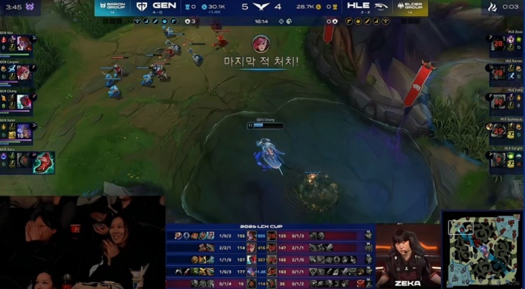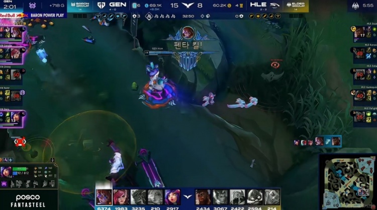 [15:55]先锋团,Kanavi赵信开大抢到先锋,但是后续团战Duro妮蔻关键坐大四个!Ruler芸阿娜完成收割了啊!侧翼Chovy永恩单防住了Kanavi赵信完成击杀,GEN一波团灭HLE,将前期劣势全部打回还领先2K!