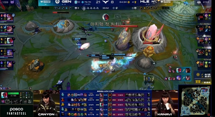 首局比赛虽然Kanavi赵信连续前期两波遭遇战建功2-0开局,但是Zeus选出上单奎桑提被Kiin阿萝拉对线压得死死!上单对位经济差不断扩大!GEN中期找到机会,先锋团完美拉扯团灭HLE一波打回前期所有劣势!随后Chovy永恩连续被抓,但是GEN趁机拿下大龙!Duro妮蔻几次大招都命中HLE多人,Ruler芸阿娜和Kiin阿萝拉轮着收割啊!