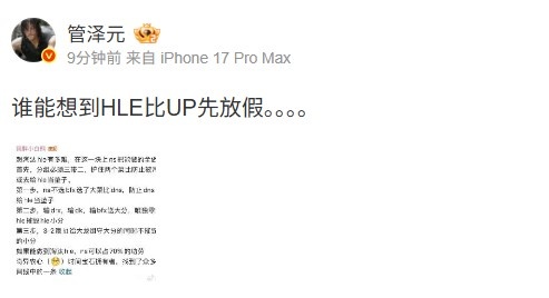 HLE惨遭淘汰后,管泽元发文:谁能想到HLE比UP先放假
