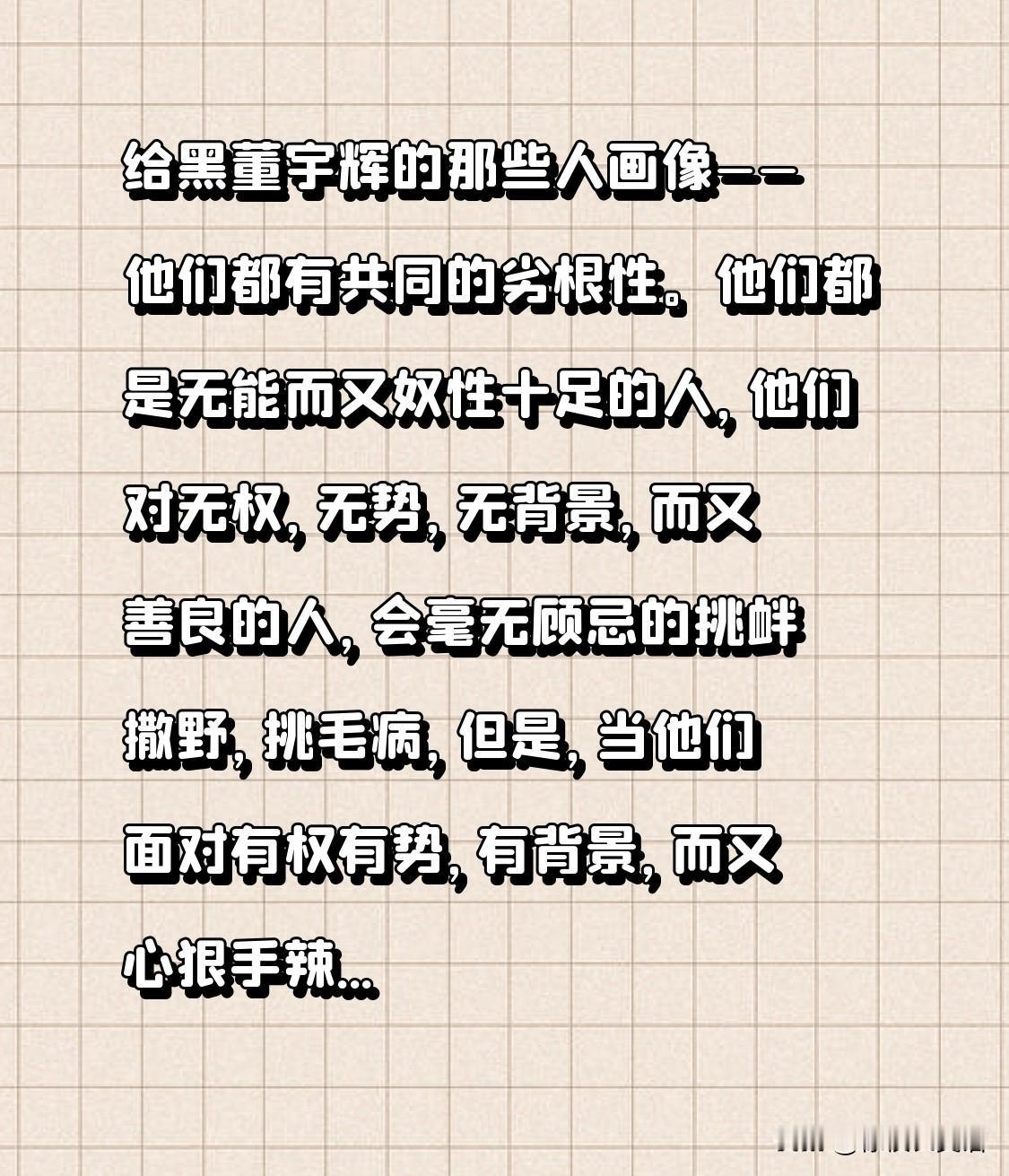 给黑董宇辉的那些人画像——他们都有共同的劣根性。他们都是无能而又奴性十足的人,他们对无权,无势,无背景,而又善良的人,会毫无顾忌的挑衅撒野,挑毛病,但是,当他们面对有权有势,有背景,而又心狠手辣的人时,他们就奴性爆棚,唯唯诺诺,卑躬屈膝。黑董宇辉的人就是这样的一些人,不值得与之争论长短。