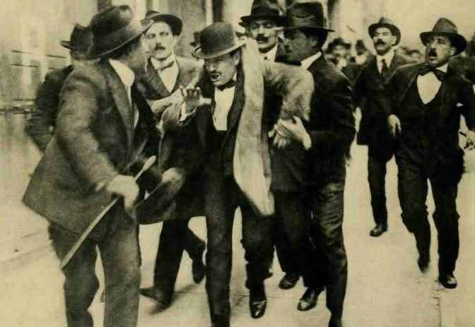 1915年,贝尼托·墨索里尼在一次鼓吹参战的集会后被强制带走的瞬间。 墨索里尼身着西装、戴着软呢帽,脖子上的浅色围巾在混乱中被扯得歪斜,他面部紧绷、嘴巴大张,似乎仍在嘶吼着煽动性的口号,被两名男子从两侧架住手臂强行拖拽。周围簇拥着同样穿着西装、戴着礼帽的便衣与旁观者,有人快步跟随,有人回头张望,整条街道都弥漫着躁动与对抗的气息。
