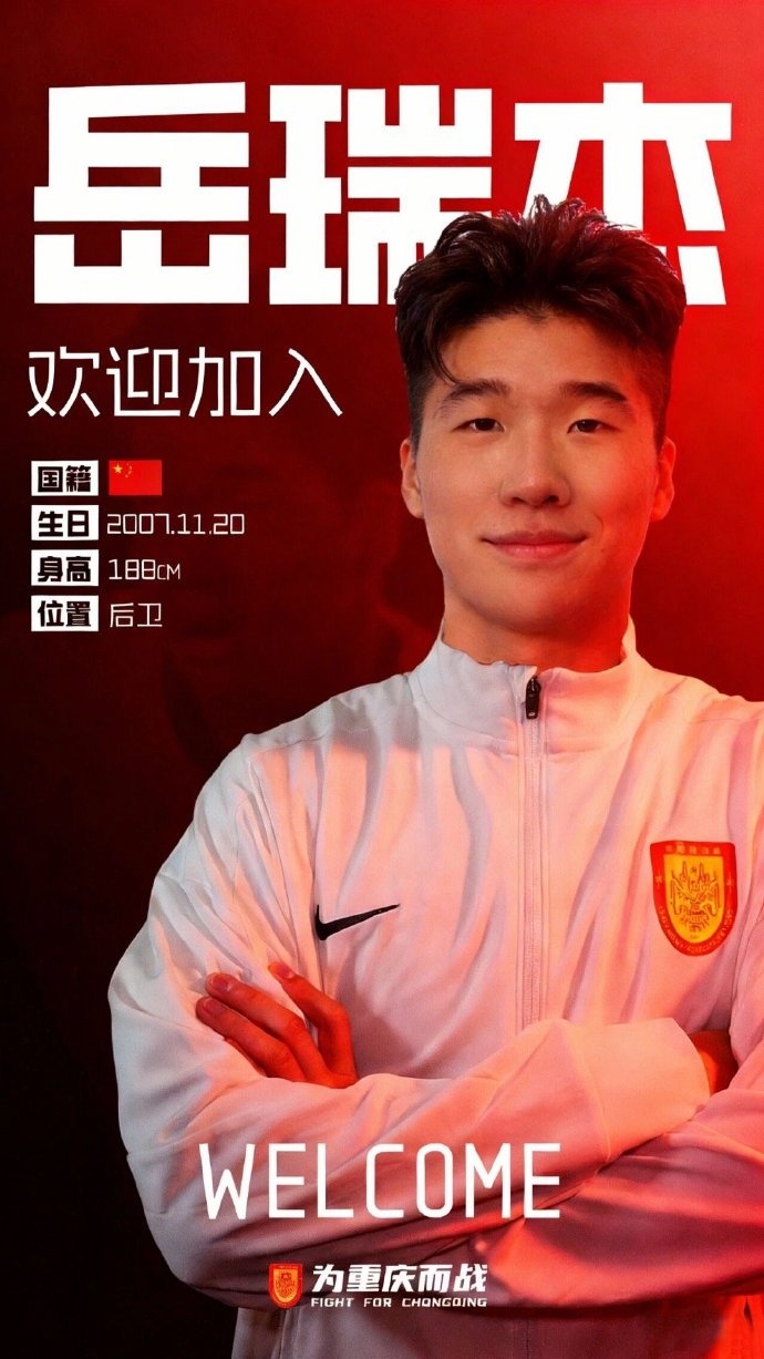 经与山东泰山足球俱乐部及球员本人友好协商并达成一致,即日起,岳瑞杰以租借形式加盟重庆铜梁龙足球俱乐部,租期一年。待完成相关注册手续后,岳瑞杰将身披重庆铜梁龙战袍,代表俱乐部出战2026赛季中超联赛及其他各项赛事。