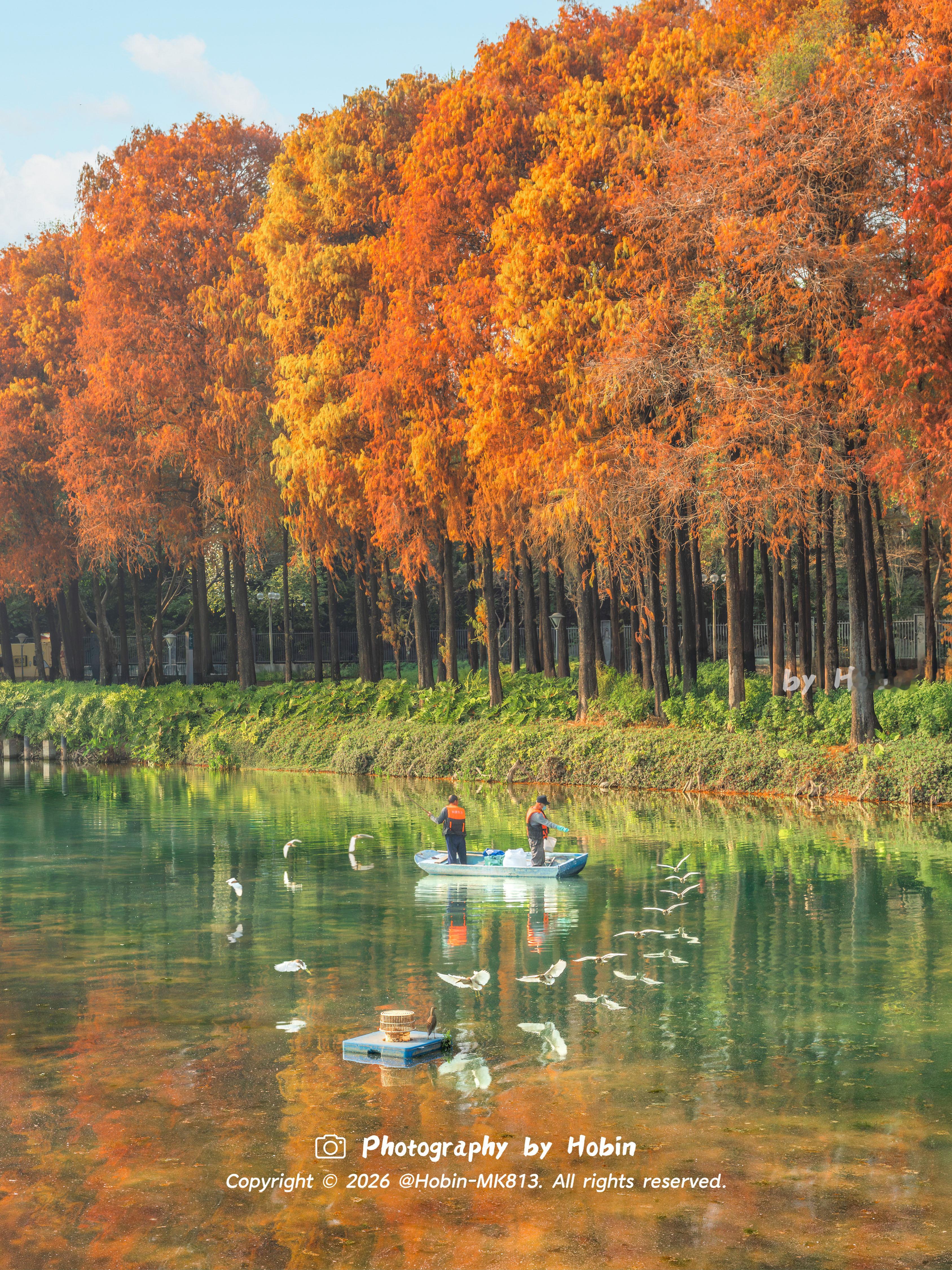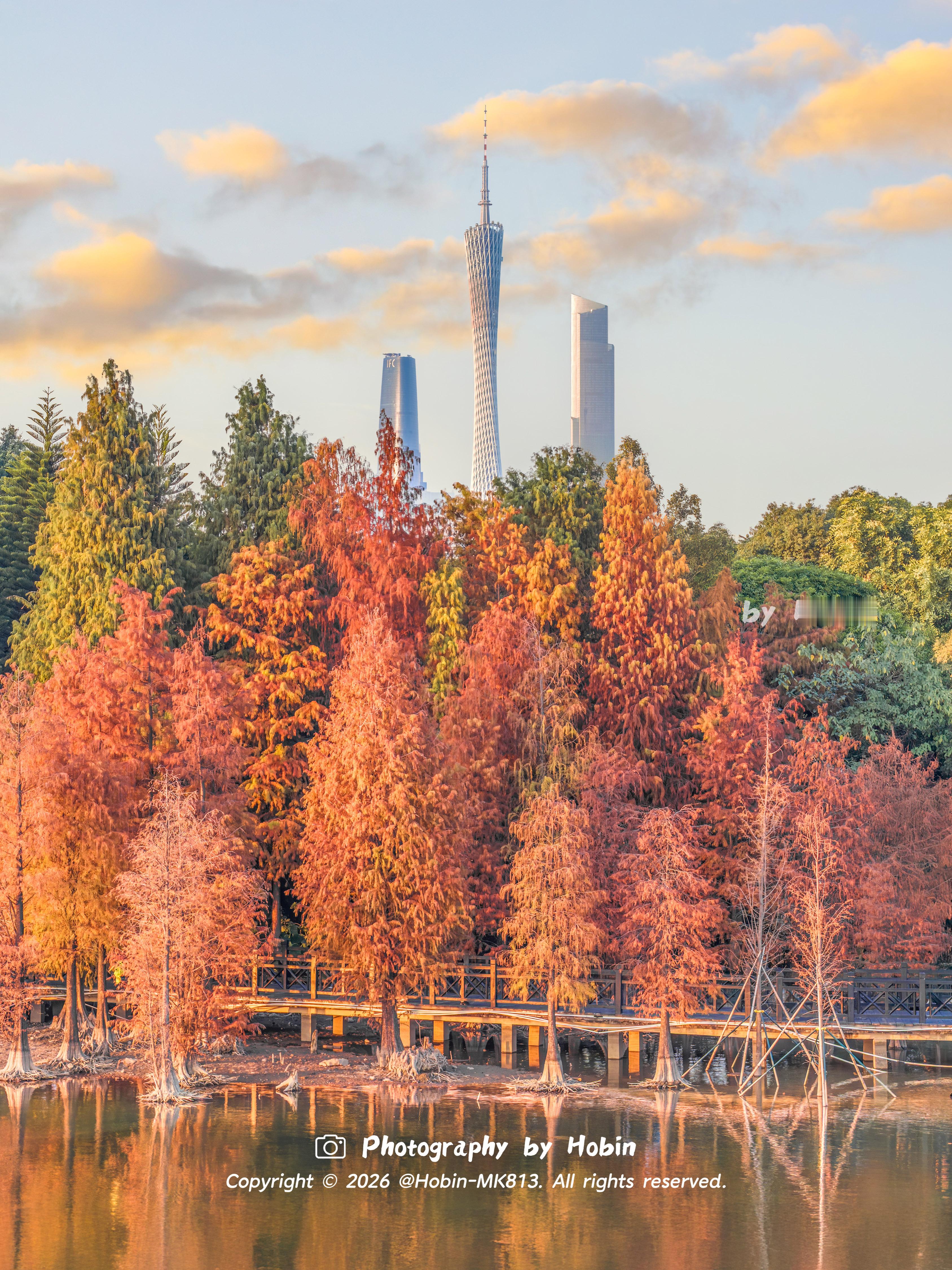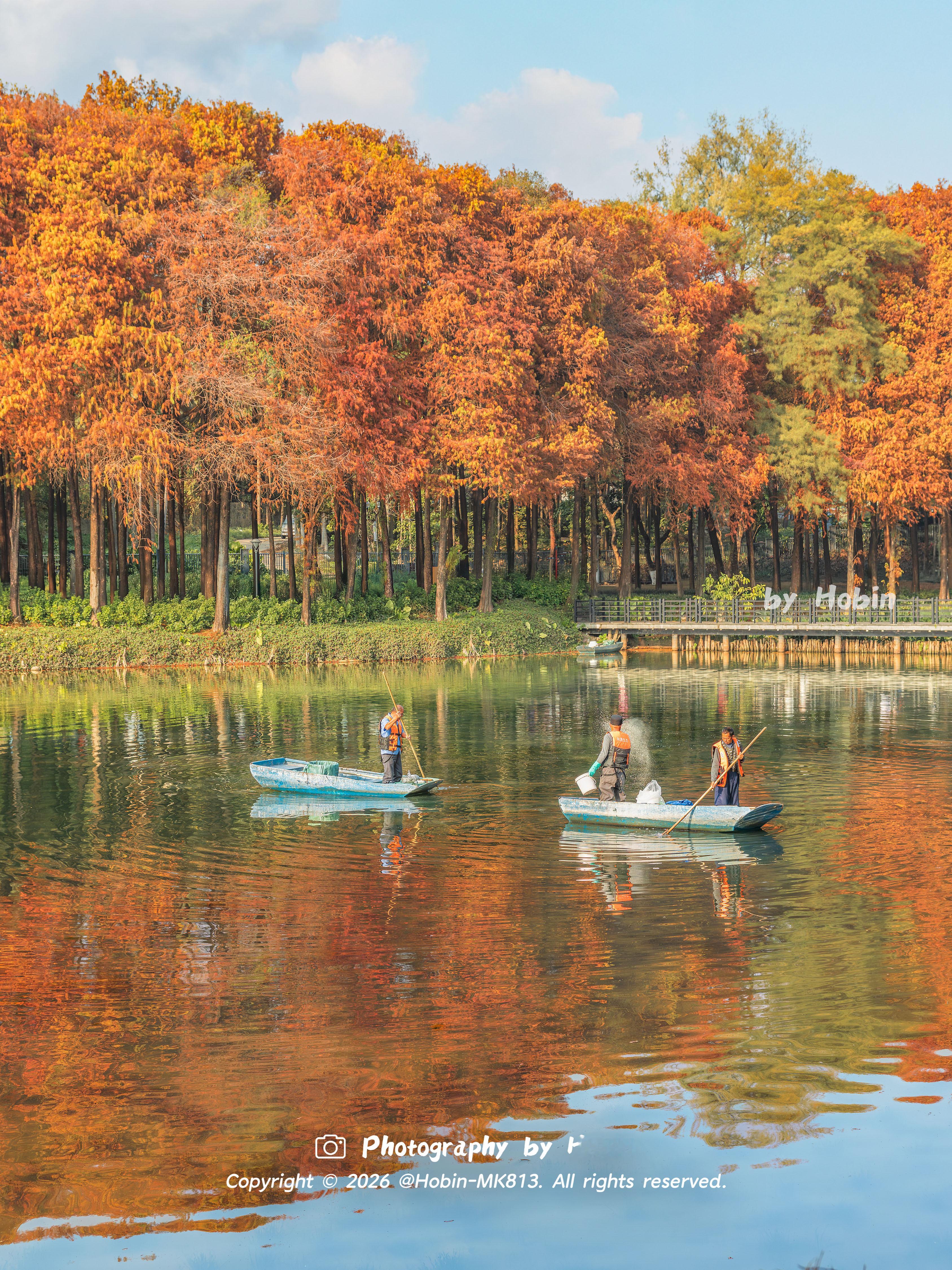 广州冬天如焦糖色的油画🧡落羽杉与碧波相融,宛如调色盘倾洒,定格成治愈的静谧诗画