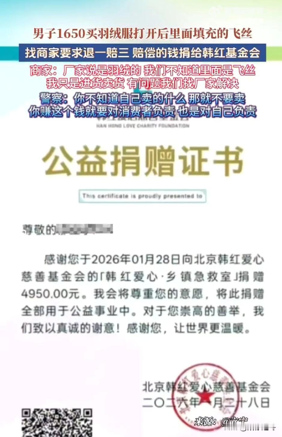 男子1650元买羽绒服全是飞丝报警! 这哥们格局真大,要求退一赔三,赔的钱现场就捐给韩红基金会了,飞丝说白了就是羽绒的边角料,保暖效果特别差,但是不拆开看手感和羽绒很像,现在有的商家真是没良心呀! 2月1日,据媒体报道,湖北武汉一男子花了1650元买了一件羽绒服,按道理来讲这个价钱质量肯定是不错的。 万万没想到的是,男子付完钱后,回家发现衣服手感摸起来不像羽绒,于是就拆开了衣服查看,发现里面并不是羽绒,反而全是飞丝和一些羽绒边角料,男子感觉自己被骗了。 第二天找到店家要求退一赔三,老板含糊其辞辩表示自己不知情,男子便报警处理。 民警赶到了解缘由后质问道:“你不知道自己卖的什么,那就不要卖,你赚这个钱就要对消费者负责也是对自己负责”。不得不说警察叔叔怼的真解气![赞] 最终老板妥协同意退一赔三,让人意外的是男子却说道:“你把赔的钱捐给韩红基金会,我不要你的钱。”这哥们格局真的大呀,把赔偿金直接捐了![鼓掌] 现在无良商家太多,大家一定要货比三家,不要被骗了,为这位小哥点赞,也为警察叔叔点赞!羽绒服被曝掺假 羽绒服掺假 飞丝假羽绒服 飞丝羽绒服 👍