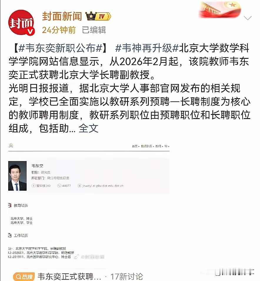 韦神,官宣了! 2月1日,学术圈传来大好消息,北大数学科学学院,官宣一个重磅消息——韦东奕正式升级为长聘副教授,直接拿下稳定的长聘教职,还能享受正高级相关待遇,这晋升速度在学术圈里堪称拔尖! 可能有人不懂长聘副教授到底啥概念,简单说就是这份工作能一直做到退休,不用再担心考核压力,而且待遇和正教授差不多。北大从2014年就实行这种预聘转长聘的制度,助理教授要在六到八年内通过严格评审才能留下,这些年数学学院能成功转正的还不到三分之一,韦东奕只用六年就做到了,确实厉害。 这事儿看着是国内学术圈的新闻,其实背后和国际上的竞争紧密相关。现在全球都在抢顶尖人才,美国的科技公司为了挖AI领域的高手,开出过一亿美金的签约奖金,欧盟也搞了蓝卡计划,给高技术人才发长期工作签证,就是为了留住能推动科技进步的人。咱们国家现在重视韦东奕这样的基础科学人才,本质上也是在参与这场国际人才竞争。 往前看几十年,美国能在科技领域领先,和二战后吸纳了全世界的顶尖科学家有很大关系。那些科学家搞的基础研究,后来都变成了航天、电子等领域的核心技术。而咱们过去在一些高端制造领域被卡脖子,比如光刻机这种关键设备,核心问题就是基础科学研究跟不上。韦东奕研究的数学,看着抽象,其实是很多高科技的基础,比如芯片设计、人工智能都离不开扎实的数学理论。 现在咱们国家越来越明白,基础科学才是科技自立的根本。韦东奕的研究已经有了实际影响,他提出的理论被编进了研究生教材,还能帮着解决流体力学里的难题,这些都能为未来的技术突破铺路。给这样的科学家稳定的工作和待遇,就是让他们能安心搞研究,不用为生活分心。 对咱们普通人来说,这事儿也不是和自己没关系。国家的科技实力强了,芯片、光刻机这些关键技术不被别人卡脖子,咱们用的手机、家电才能更先进,生活才能更方便。而且韦东奕那种低调朴实、专心做事的态度,也让大家看到,真正的人才不用靠炒作,靠实力就能得到认可。 各位读者你们怎么看?欢迎在评论区讨论。