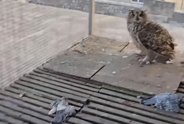 近日,在河北保定,一只国家二级重点保护野生动物雕鸮钻进鸽笼,咬死8只赛鸽。