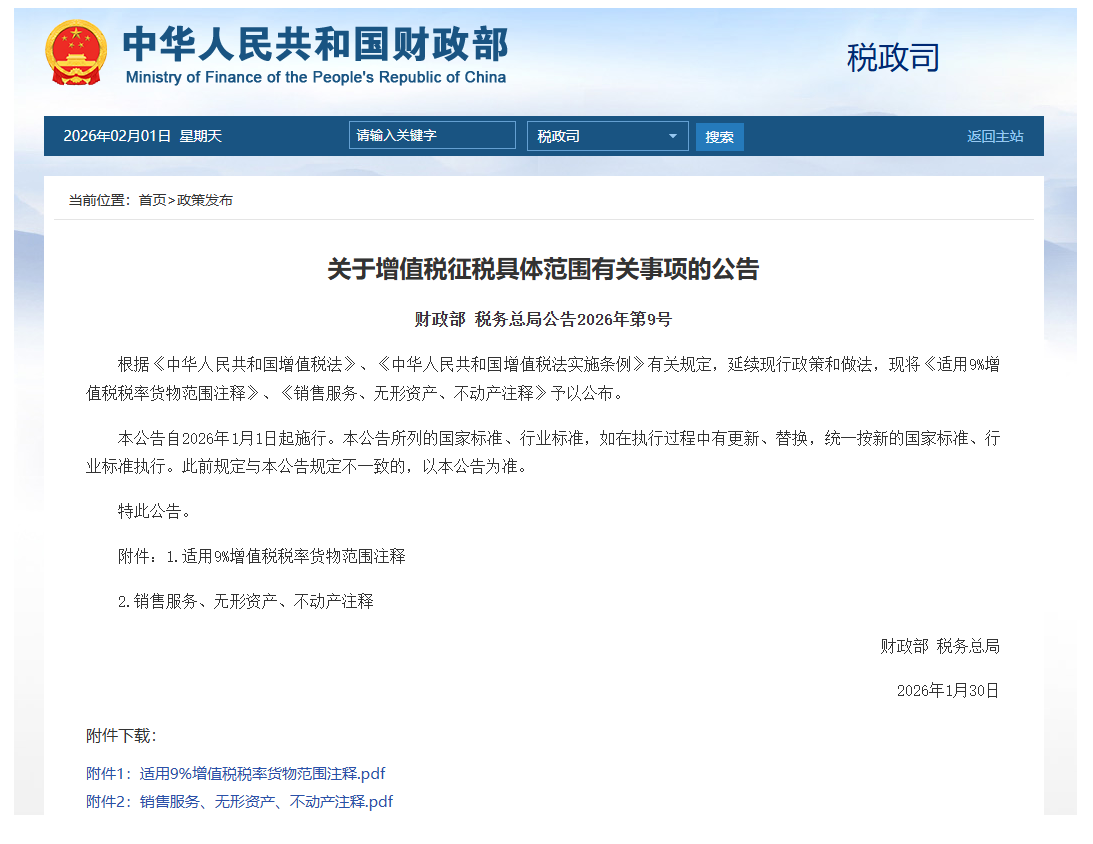 昨天(1月31日),财政部、税务总局发布《关于增值税征税具体范围有关事项的公告》,明确了适用9%和6%增值税税率范围,以及销售服务、无形资产、不动产具体范围,这涉及多档税率。该《公告》自2026年1月1日起施行。