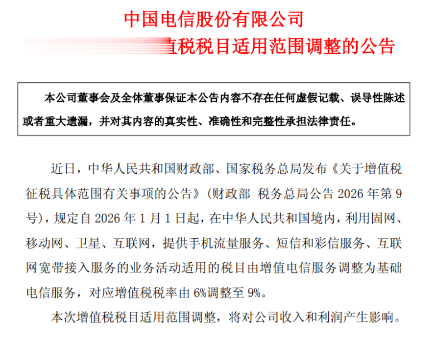 中国电信今日公告称,近日,中华人民共和国财政部、国家税务总局发布《关于增值税征税具体范围有关事项的公告》(财政部税务总局公告2026年第9号),规定自2026年1月1日起,在中华人民共和国境内,利用固网、移动网、卫星、互联网,提供手机流量服务、短信和彩信服务、互联网宽带接入服务的业务活动适用的税目由增值电信服务调整为基础电信服务,对应增值税税率由6%调整至9%。本次增值税税目适用范围调整,将对公司收入和利润产生影响。