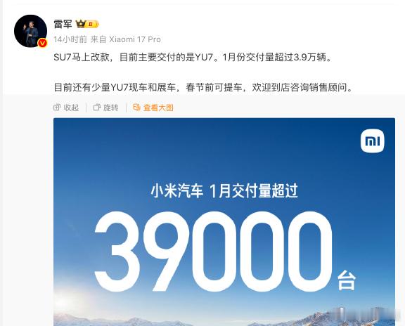 懂车之道讯 近日,懂车之道获悉,小米汽车公布1月销量数据,1月交付量超过39000台。随后雷军在社交媒体上表示,小米SU7马上要改款。