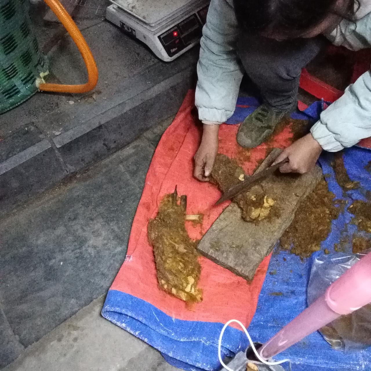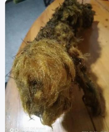 认识一种中药材~金毛狗 今天傍晚,在巴马坡月的街上,一位中年女子拿了两块树根模样的东西在售卖,啊一位顾客已决定下单(见图片一,二)。 不懂就问卖主讲,这是中药材金毛狗,而且强调是野生的,只卖5元一斤。 只见女子把药材到外面的类似毛绒的东西砍掉,然后将其再砍成块儿卖给顾客。 回来赶紧查了一下,它还真是一种具有除湿止痛和抗氧化功能的中药材。 又学习了知识,长了见识。不过最好不要买野生的原因,请朋友们自己查一下吧。