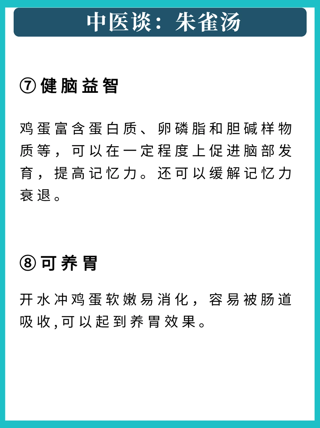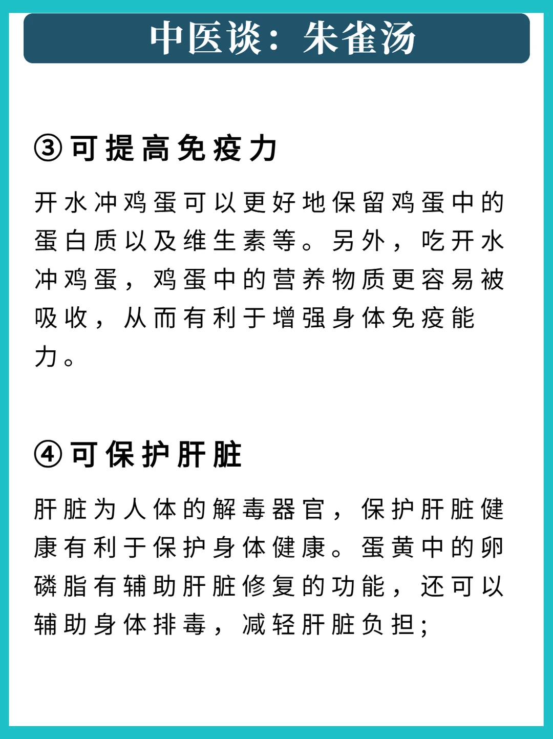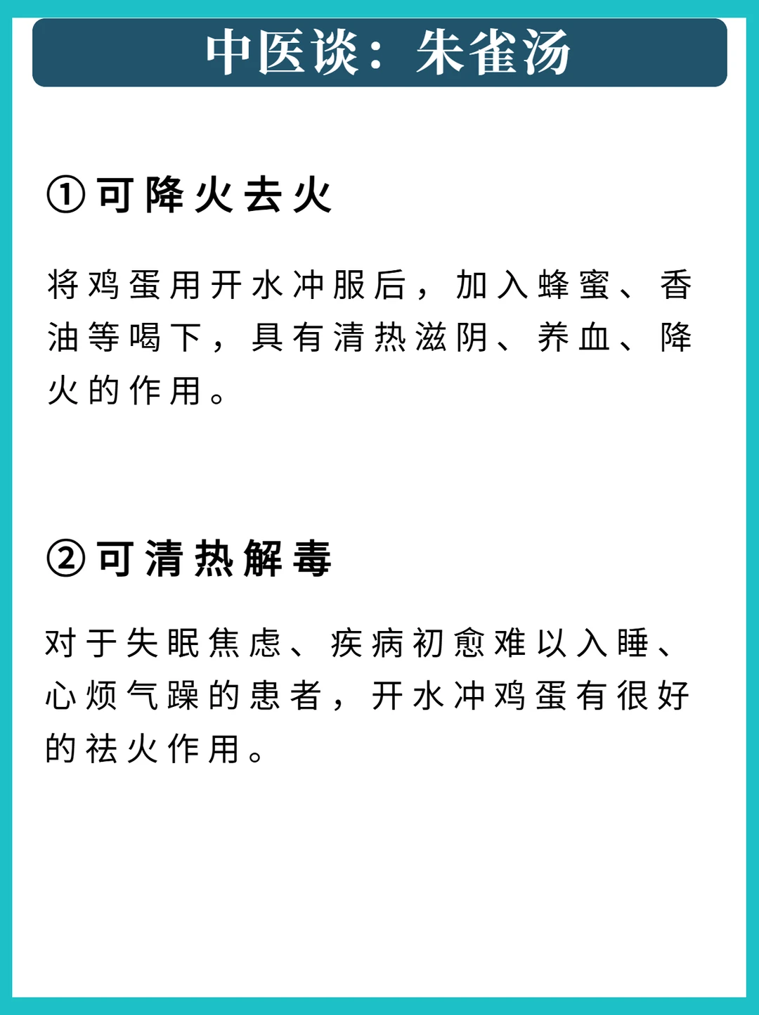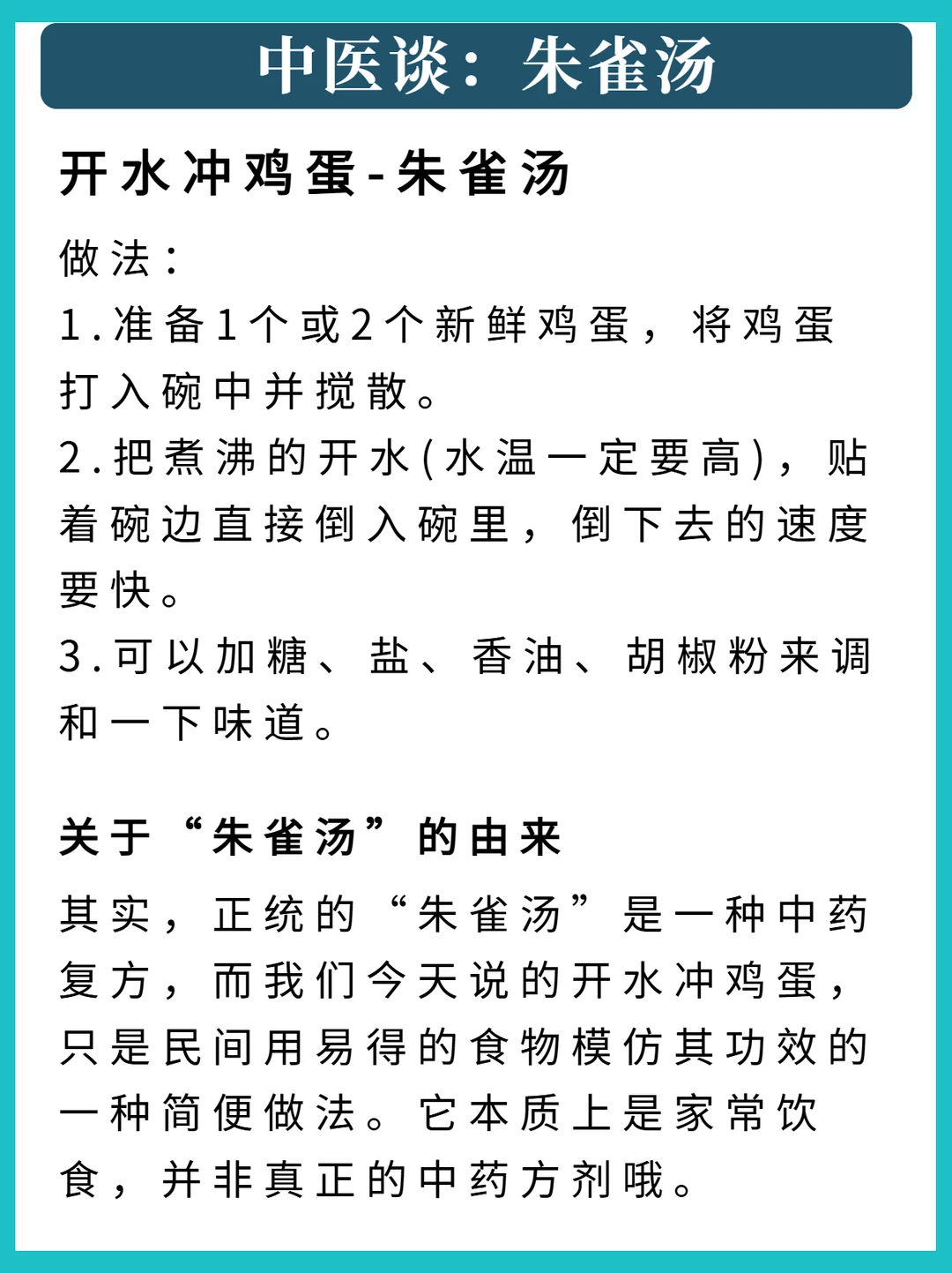 正文: 宝子们,今天给大家安利一个老祖宗传下来的养生妙方——朱雀汤,其实就是开水冲鸡蛋。