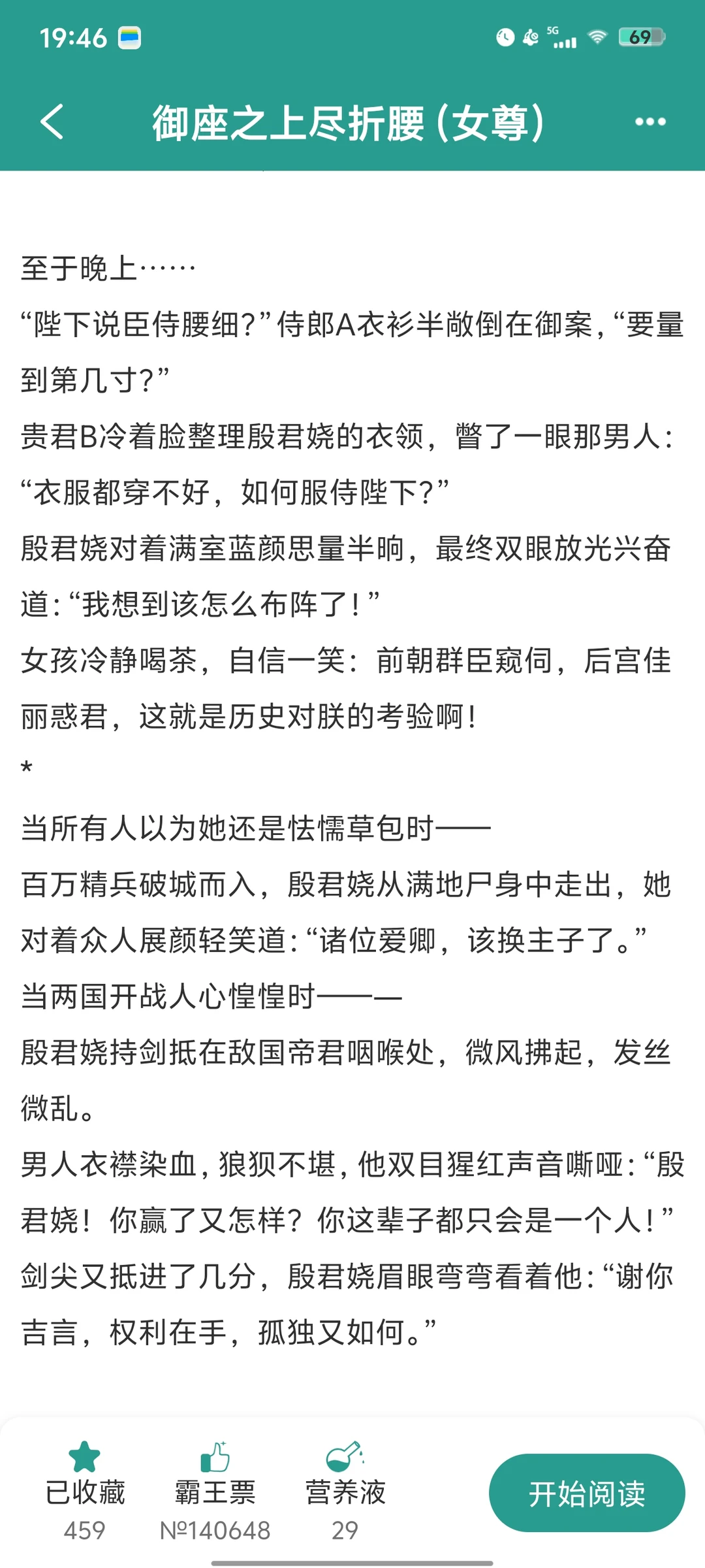 书名:《御座之上尽折腰》 正在连载的小说 野心勃勃女帝,穿越女尊世界, 升级流,乱世争霸,女强爽文, 好久没看到这么正统的女强争霸文了,女主一言不合就开干。女主穿越到女尊世界,成了皇帝。但是实际没多少地位权力,外敌虎视眈眈,内有摄政王把控朝堂,她说白了,就一傀儡。女主随机应变,一边演戏,一边夺权。随着女主权力越来越大,牵扯到的事情越来越多,女主还会和敌国产生冲突。女主始终脑子清醒,内外兼顾。