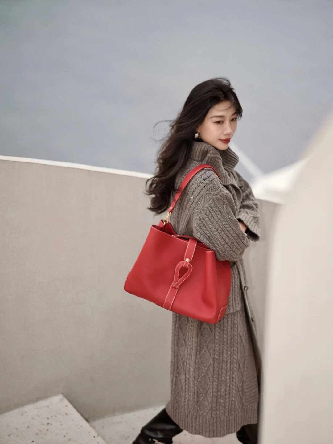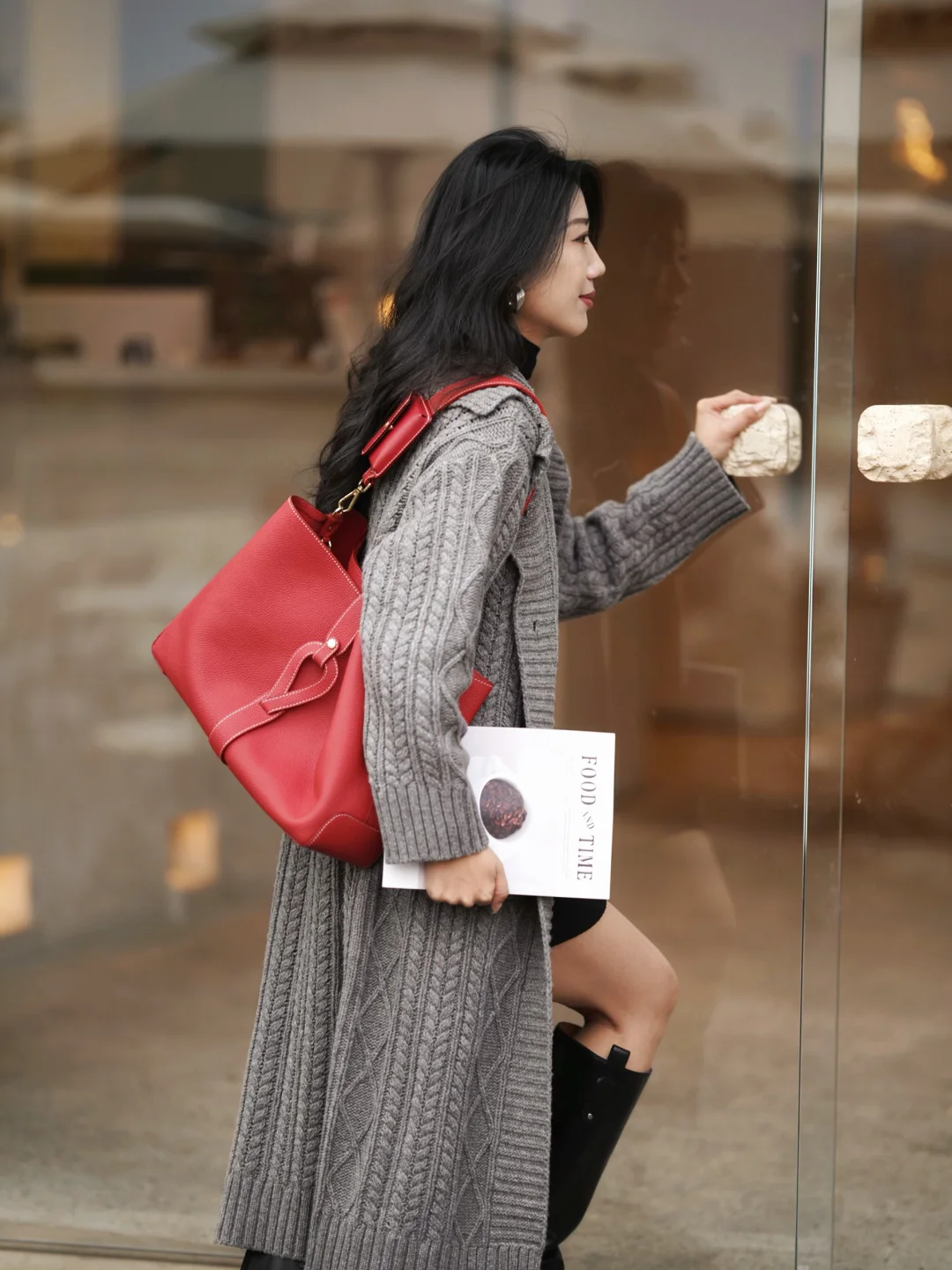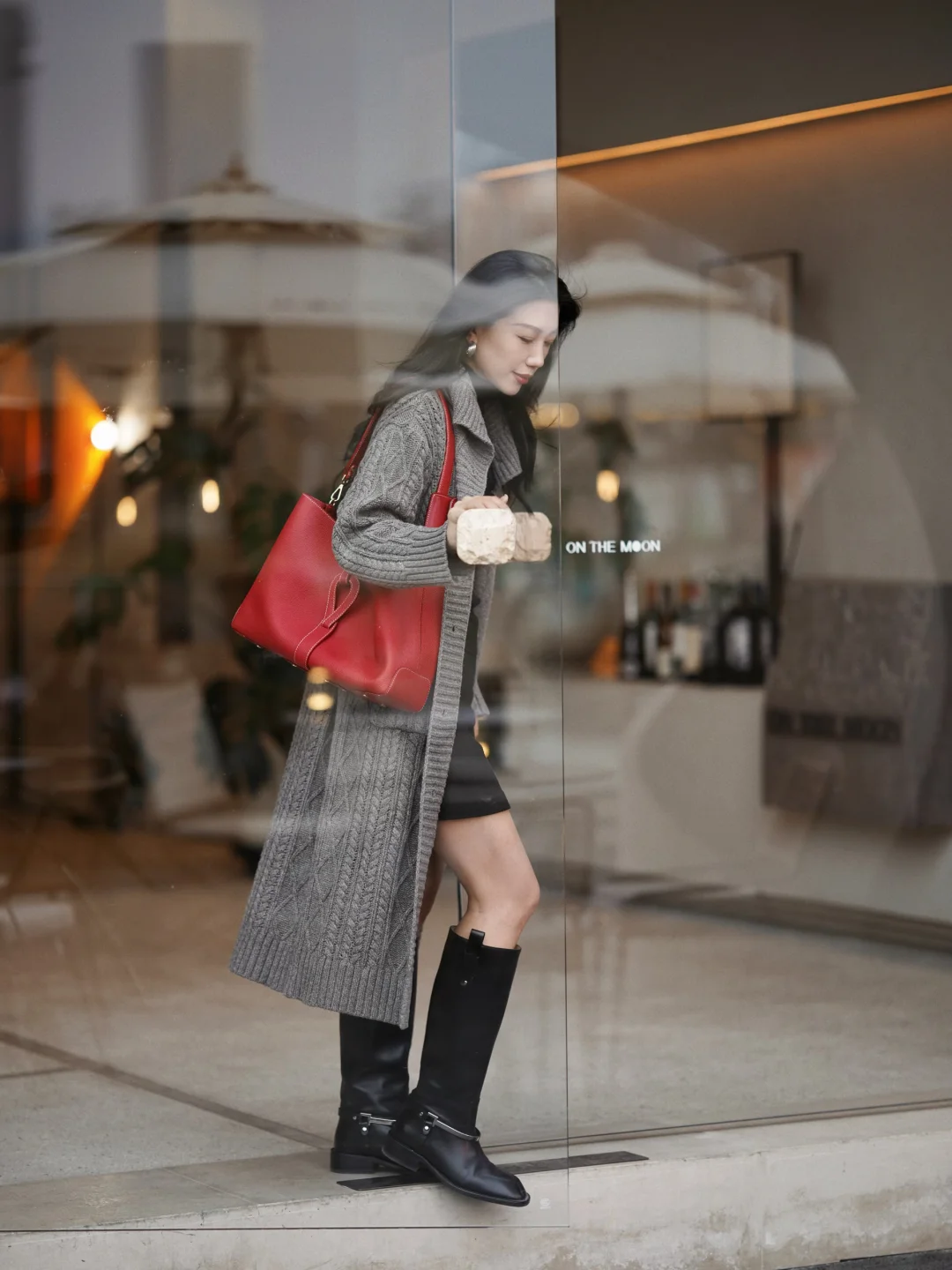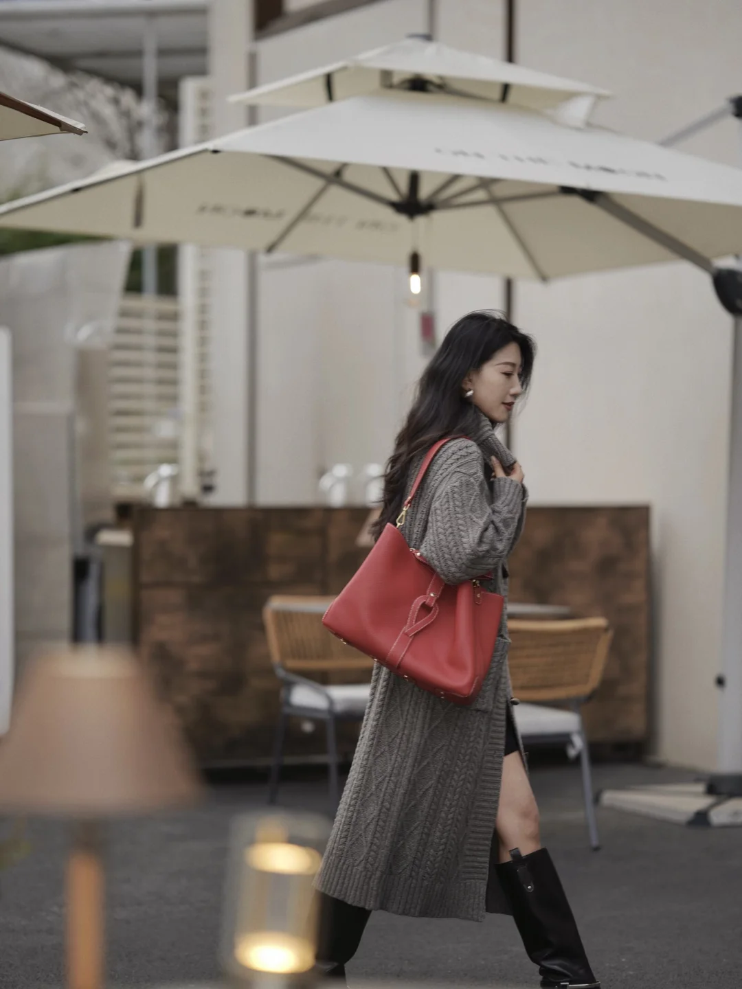 灰毛衣的软糯,像把整个冬天的云都穿在了身上。而那一抹红,是突然从心底亮起的焰火。 冬日总要有些“敢耀眼”的时刻。不必多,一只红色手袋就好——把晨起梳妆的好气色,把街角咖啡的暖意,把暗藏雀跃的心事,统统装进去。它悬在臂弯,随着步伐轻轻晃动,装下了一整个冬天的心事一般。 灰的沉静,衬出红的明媚。当从一片素色中走过,衣着与心情,都亮了起来。