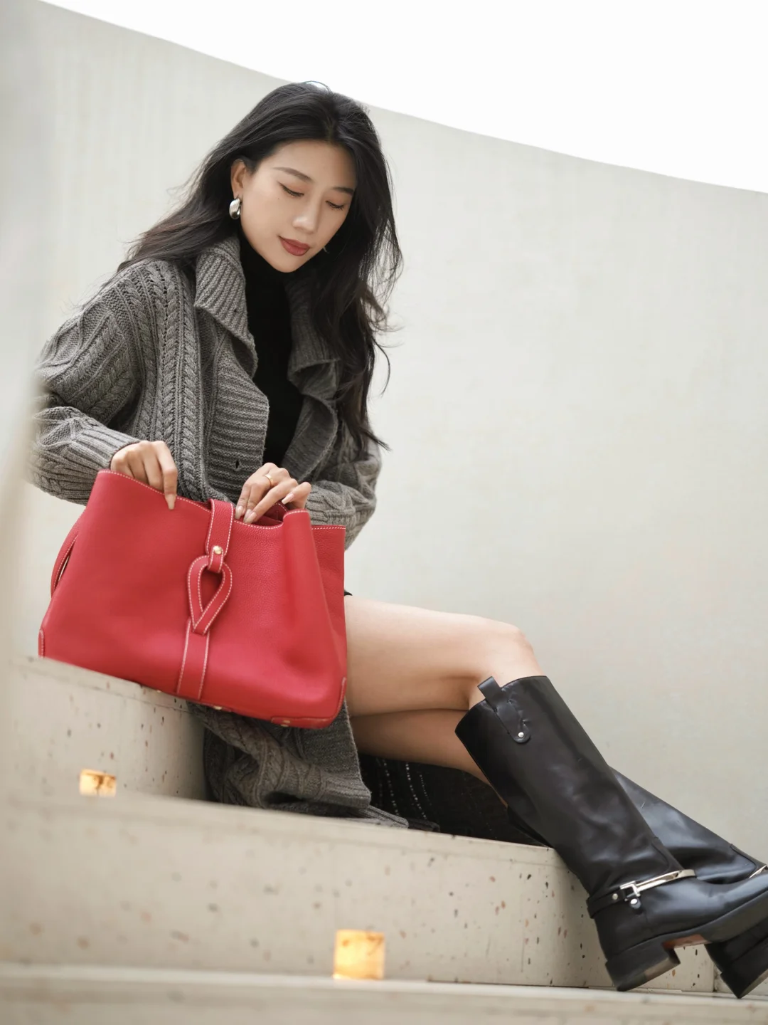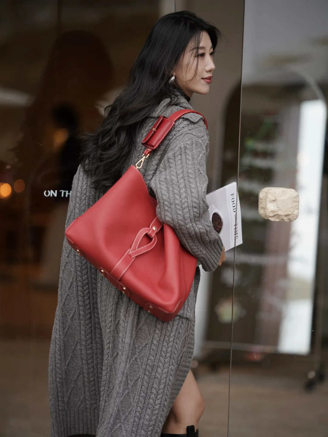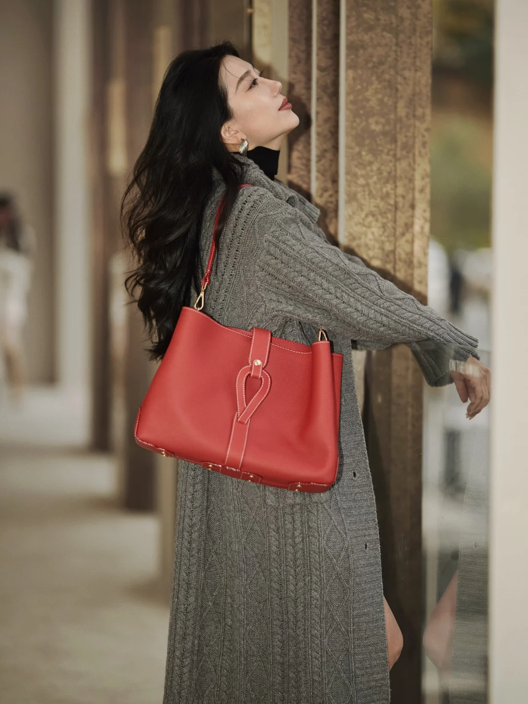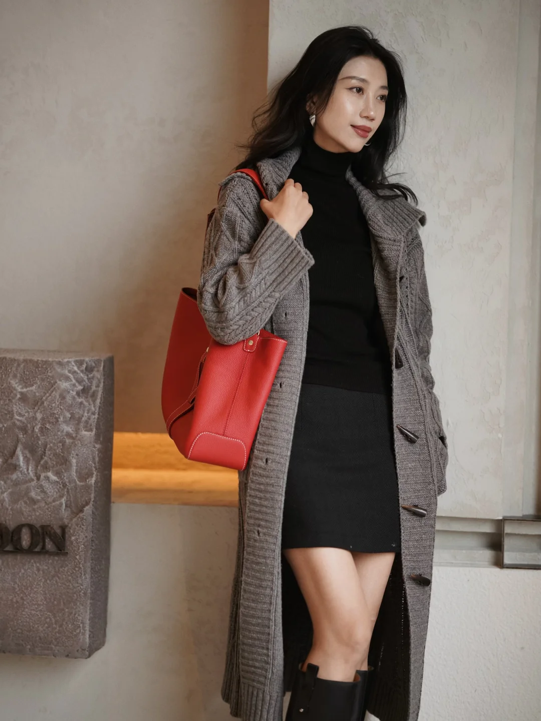 灰毛衣的软糯,像把整个冬天的云都穿在了身上。而那一抹红,是突然从心底亮起的焰火。 冬日总要有些“敢耀眼”的时刻。不必多,一只红色手袋就好——把晨起梳妆的好气色,把街角咖啡的暖意,把暗藏雀跃的心事,统统装进去。它悬在臂弯,随着步伐轻轻晃动,装下了一整个冬天的心事一般。 灰的沉静,衬出红的明媚。当从一片素色中走过,衣着与心情,都亮了起来。