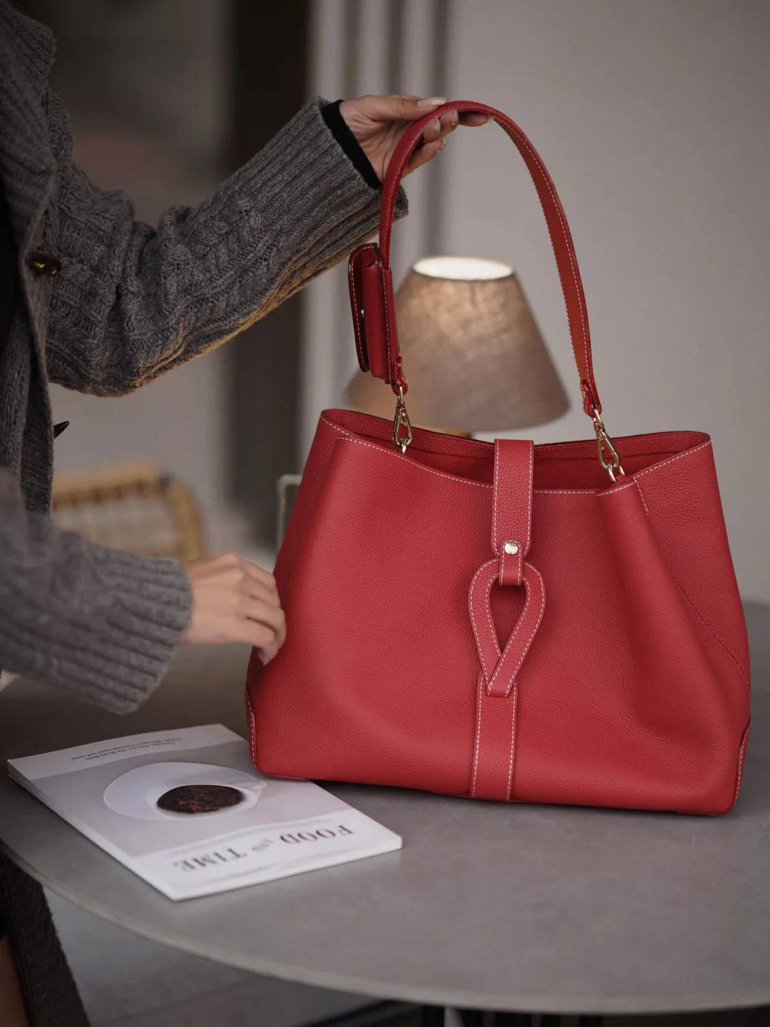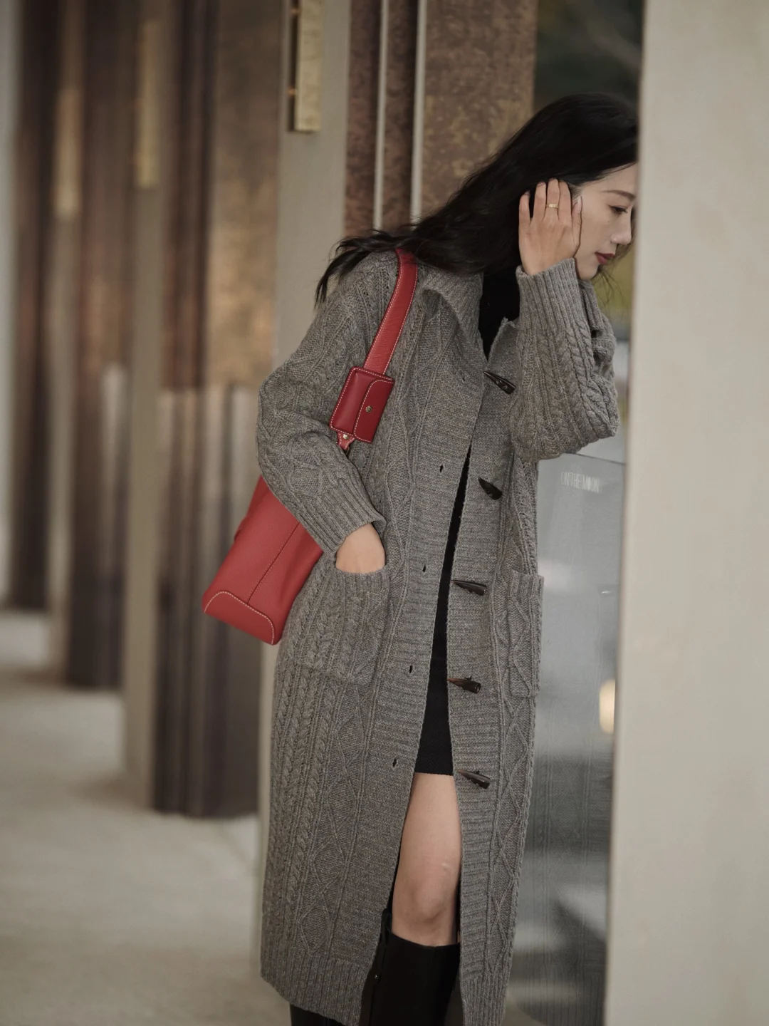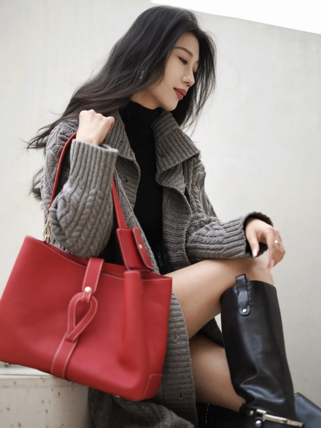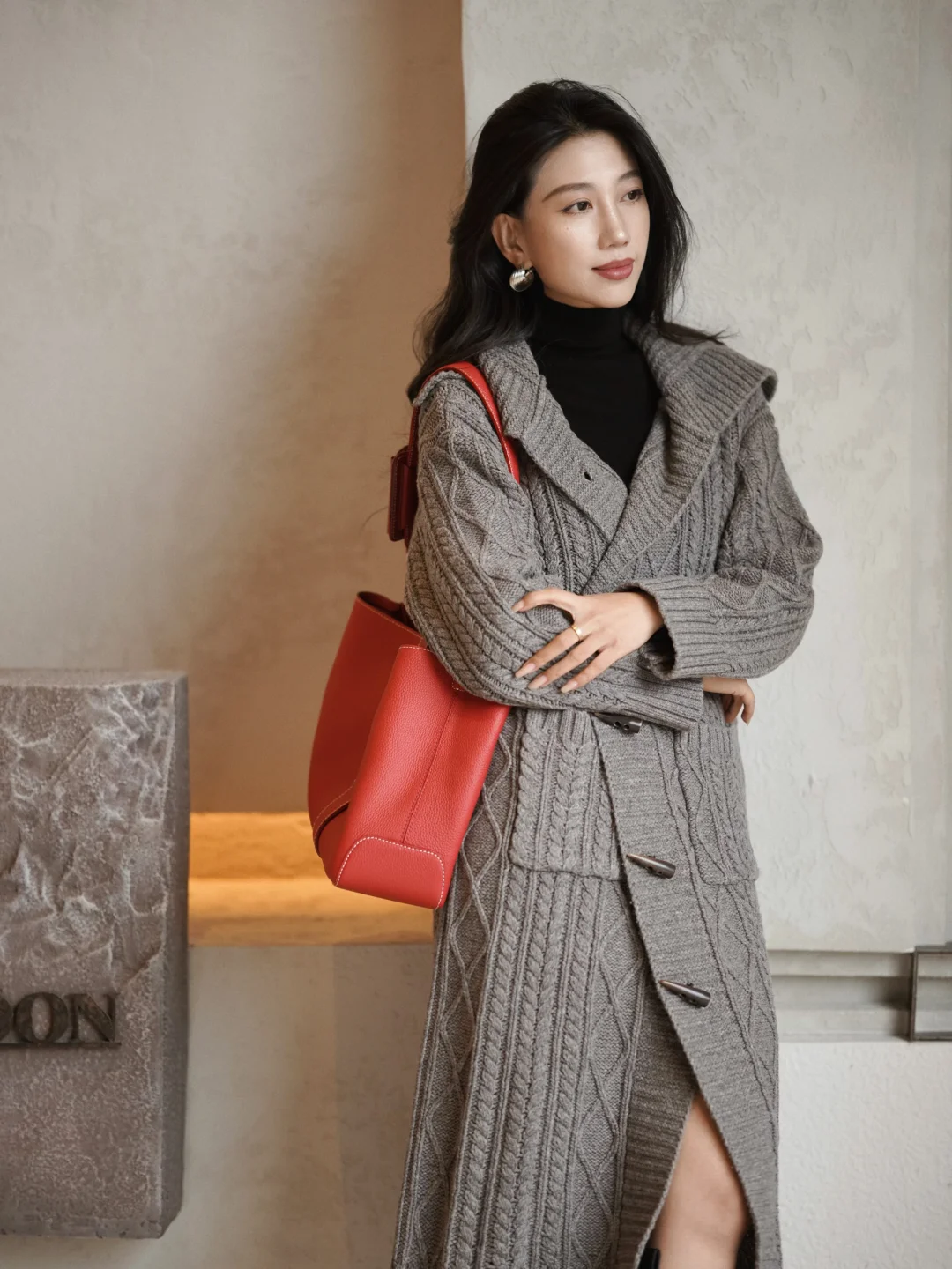 灰毛衣的软糯,像把整个冬天的云都穿在了身上。而那一抹红,是突然从心底亮起的焰火。 冬日总要有些“敢耀眼”的时刻。不必多,一只红色手袋就好——把晨起梳妆的好气色,把街角咖啡的暖意,把暗藏雀跃的心事,统统装进去。它悬在臂弯,随着步伐轻轻晃动,装下了一整个冬天的心事一般。 灰的沉静,衬出红的明媚。当从一片素色中走过,衣着与心情,都亮了起来。