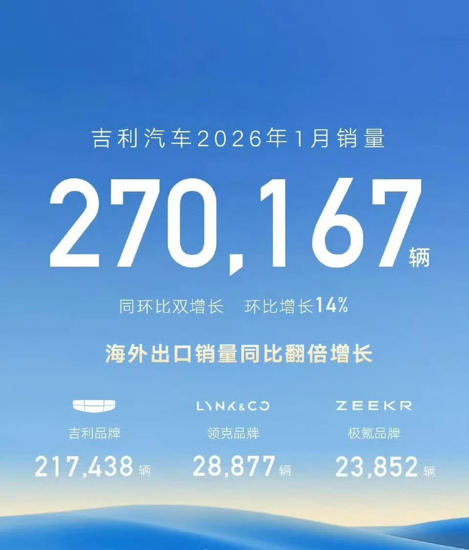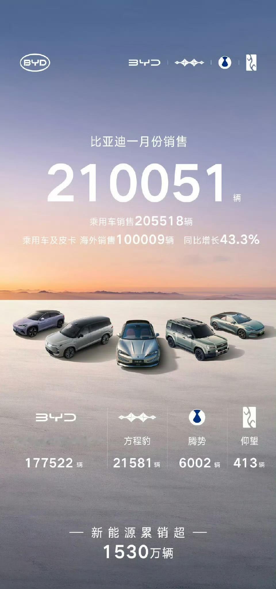 比亚迪2026年1月新能源汽车销量为210051辆,同比下滑30.11%,但海外出口首次突破10万辆大关。 王朝/海洋网177522辆 方程豹21581辆 腾势6002辆 仰望413辆 值得一提的是,吉利以270167辆(同比微增1%)超越比亚迪成为1月国内销冠,应该是唯一一个环比同比双增长的品牌。【来自懂车帝车友圈】