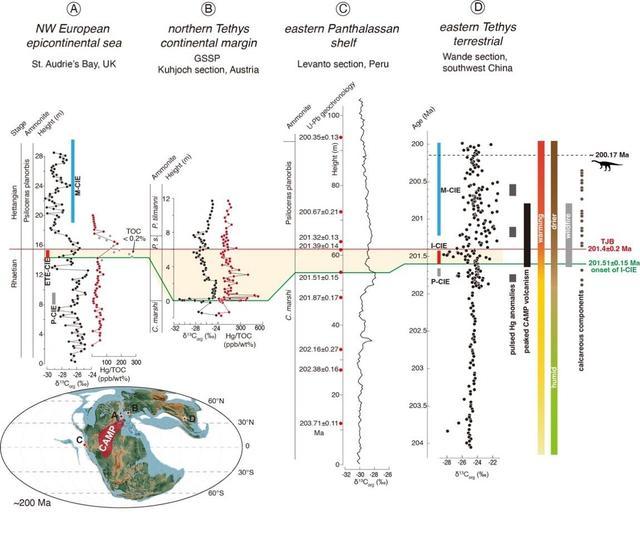 三叠纪至侏罗纪过渡期全球经典剖面与万德剖面多指标对比。