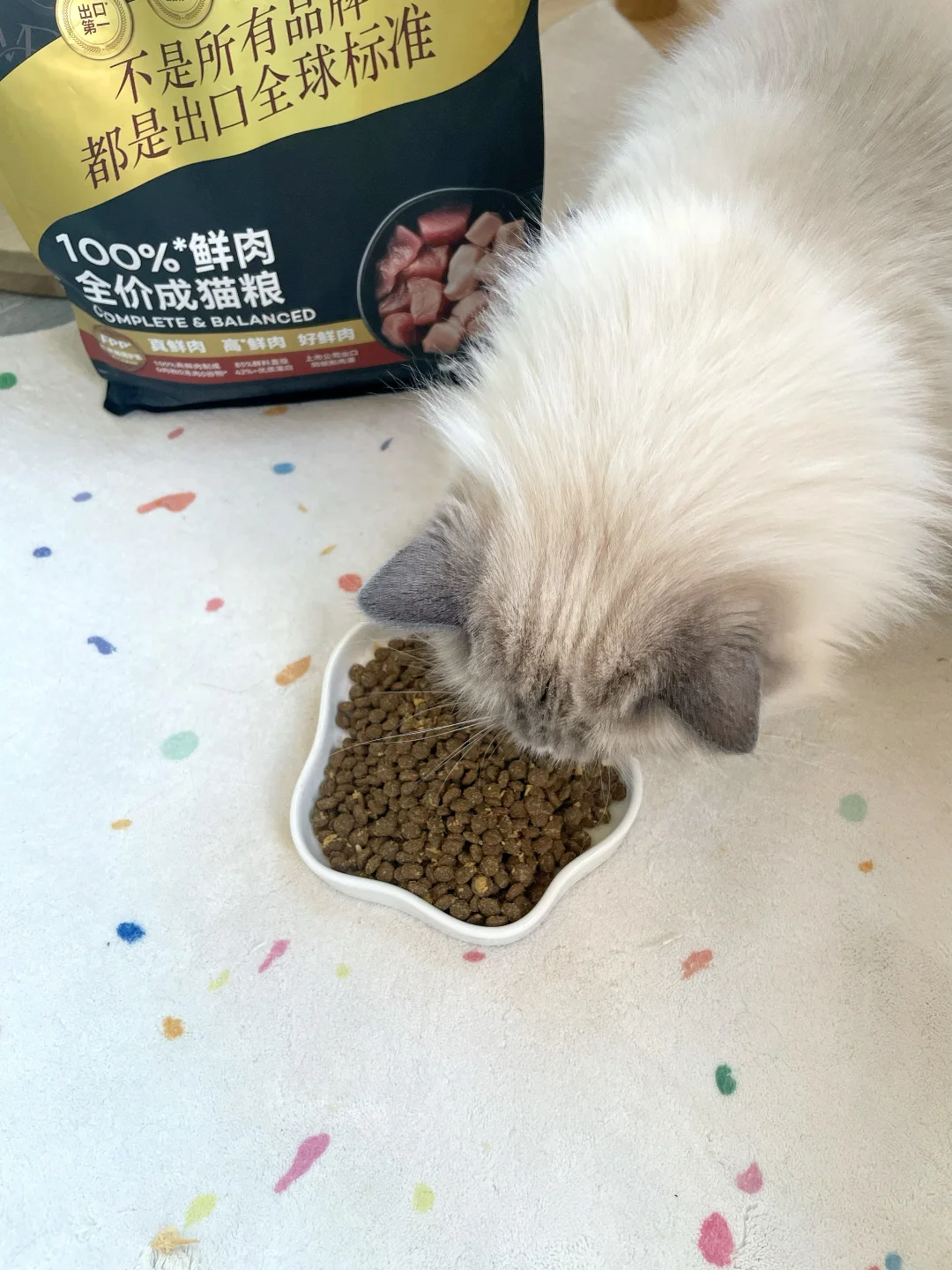 85%鲜肉组合(60% 鲜鸡肉 + 22% 鲜鸭肉 + 3% 鲜鸡肝),全是实打实的鲜肉,配料表里压根看不到肉粉、冻肉的影子。颗粒还裹满了冻干绒,对我家挑食的小猫来说,这种纯鲜肉的香味太顶了,以前放粮还要哄,现在一倒碗就主动冲过来炫;