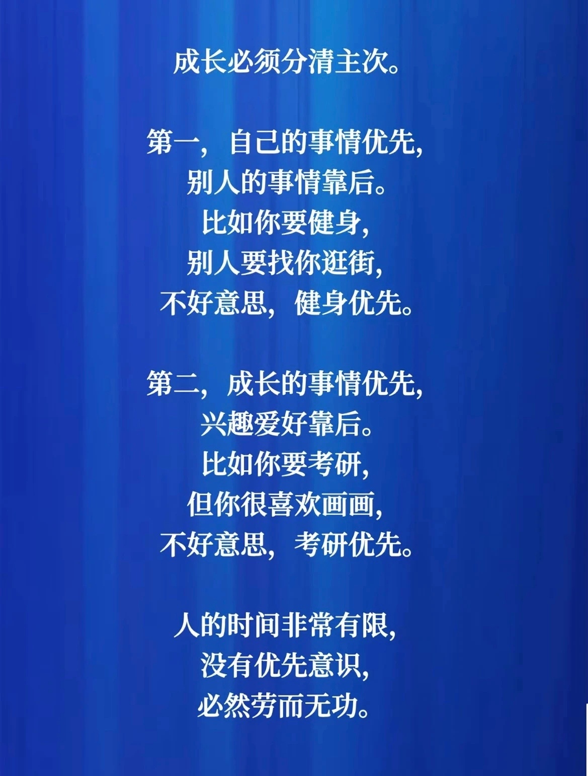 人的时间非常有限,没有优先意识,必然劳而无功。心情不好,就安静的待一会儿,等自己把情绪处理好了,再去处理事情,你会发现很多原本想不通的突然就通了,很多原本放不下的,慢慢就淡了,放下以前放不下的东西,才会开启全新的人生。