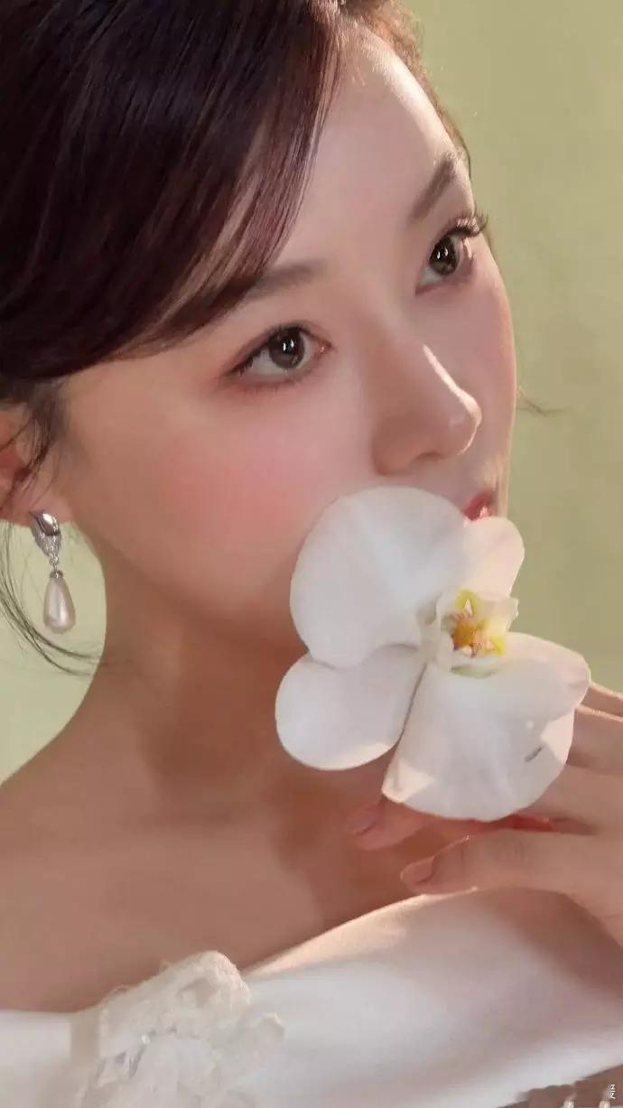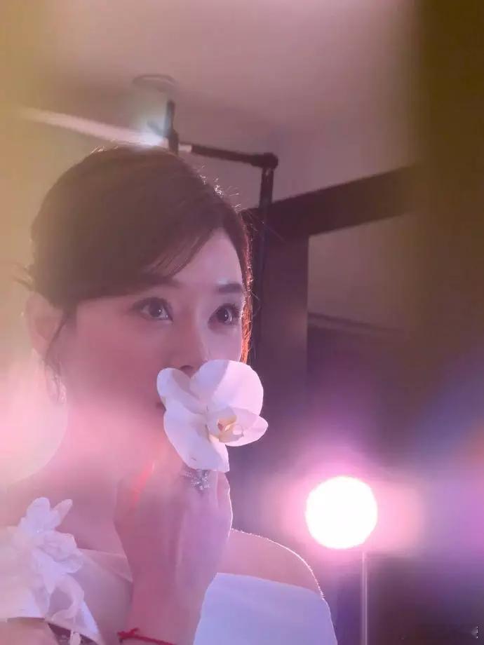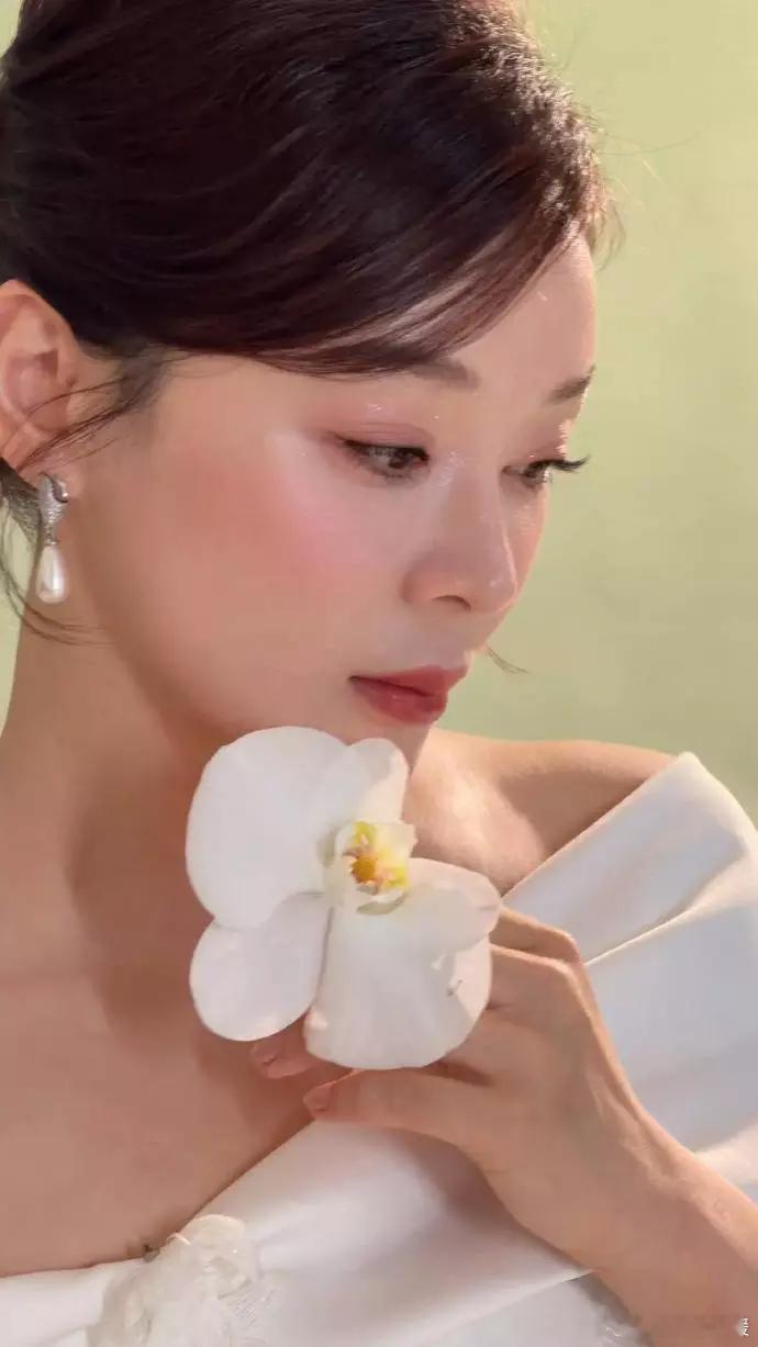 文亦娱乐袁姗姗盘发持花造型吸睛 白缎露肩礼服尽显温婉清雅