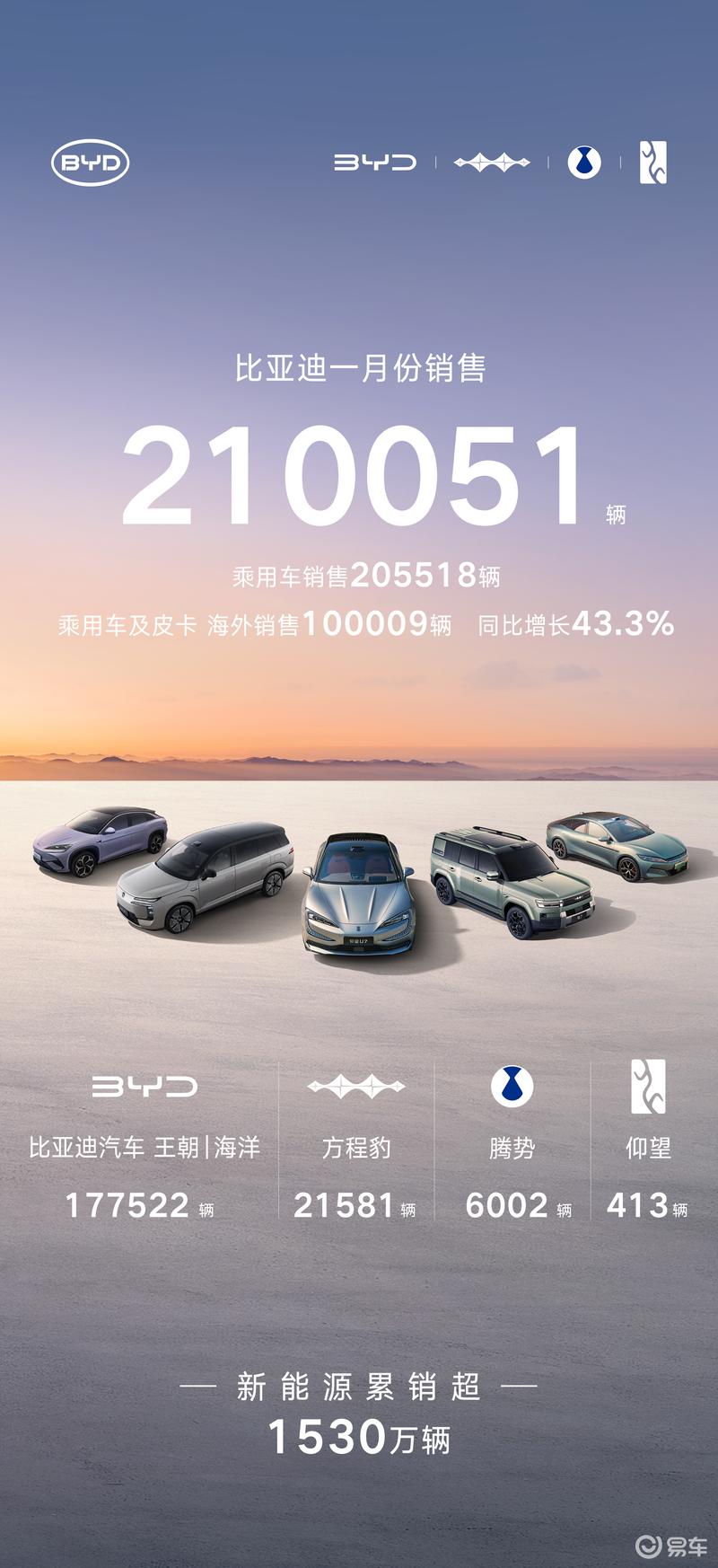 易车讯2月1日,比亚迪汽车公布最新销量数据。2026年1月比亚迪销量210051辆,夺得中国新能源汽车销量冠军。其中乘用车销售205518辆;乘用车及皮卡、海外销售100009辆,同比增长43.3%;新能源累计销售超1530万辆。