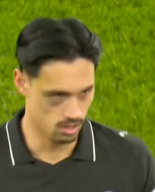 有点可怜,赖因德斯替补登场,顶着此前欧冠时受伤造成的熊猫眼