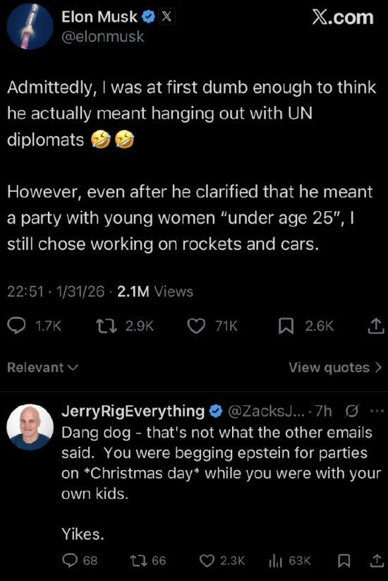 此外,马斯克还试图解释那个“最狂野的派对”:“老实说,一开始我确实蠢到以为他真的指的是和联合国外交官们一起聊天不过,即便在他澄清是和“25岁以下”的年轻女性一起开趴之后,我还是选择了继续搞火箭和汽车。”