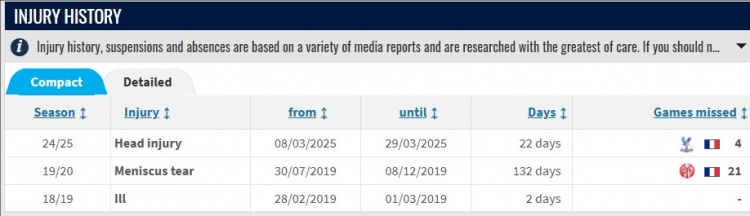 德转官网的资料显示,现年28岁的马特塔在职业生涯中仅有3次伤病,但引人注意的是,他在2019年为美因茨效力时曾遭遇半月板撕裂,并因此伤缺了132天,错过21场比赛。