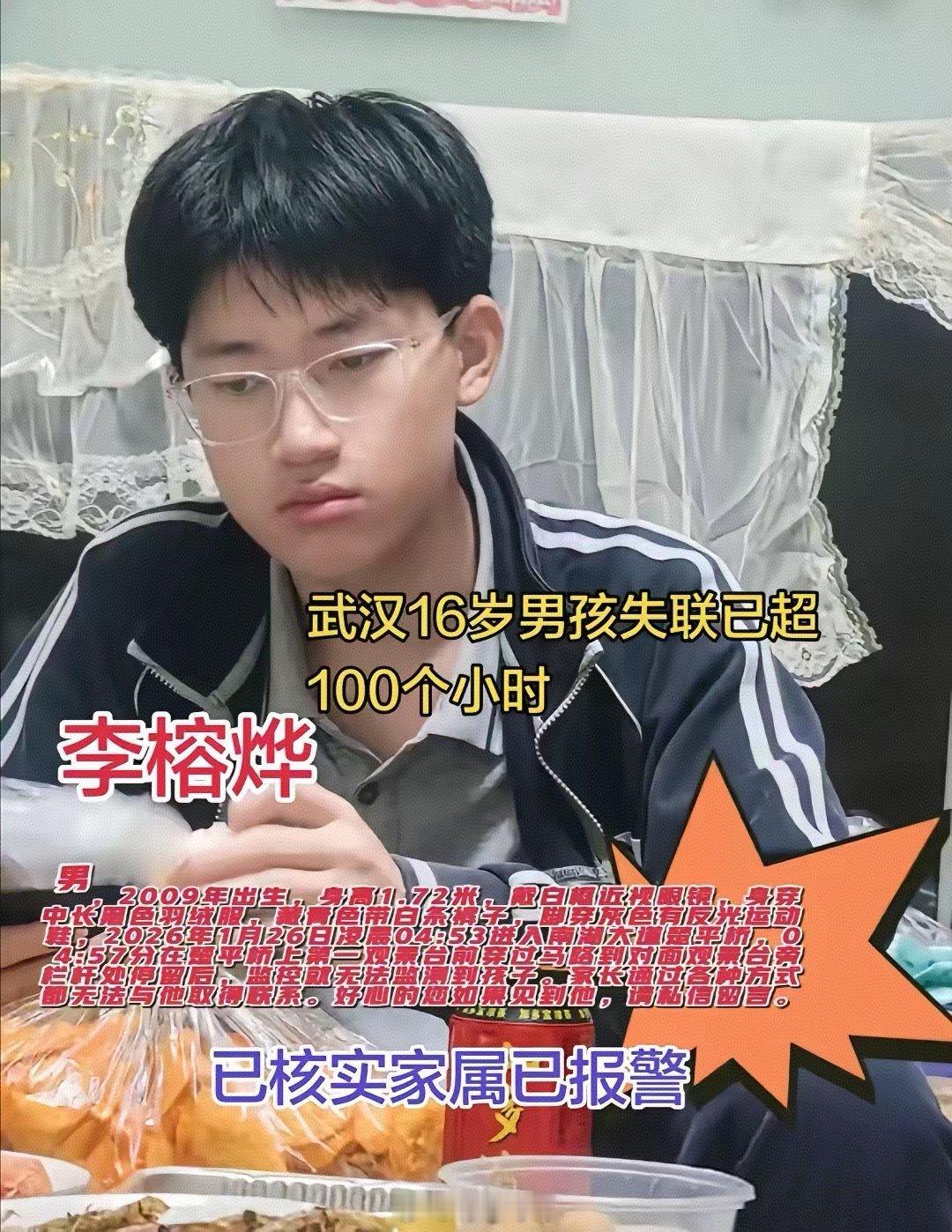 武汉16岁男孩李榕烨已失联超8天🕒 失联时间:1月26日凌晨3时许📍 最后轨迹:1月26日4:53 南湖大桥中段,随后进入视频盲区👀 体貌特征:16岁,身高1.72米,戴白框眼镜,穿黑色中长羽绒服、藏青白条裤、灰色反光运动鞋⚠️ 重要情况:离家时没带手机、现金、钥匙孩子因通宵玩手机被收手机负气出走,武汉及周边的朋友,麻烦多留意身边!有任何线索请立刻联系警方或家属🙏愿孩子平安回家!