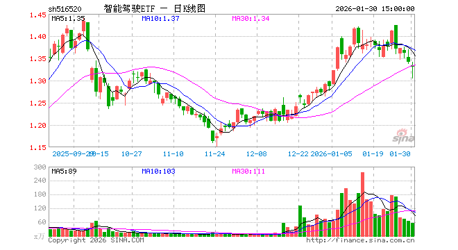 1月30日,智能驾驶ETF(516520)跌0.82%,成交额7484.12万元。当日份额减少400.00万份,最新份额为8.54亿份,近20个交易日份额增加3.52亿份。最新资产净值计算值为11.37亿元。