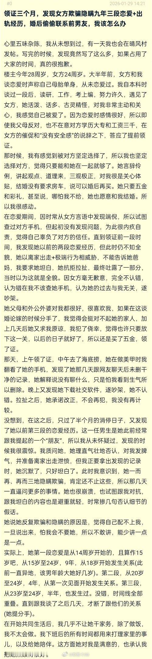 领证三个月,发现妻子欺骗隐瞒三段恋爱+出轨经历,婚后偷偷联系前男友,该怎么办”当然是认亏,赔钱出局了,还能怎么办。。。托的越久绿帽子越扎实啊。。。