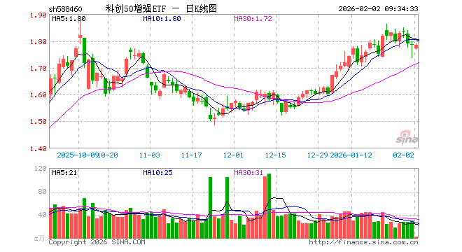 2月2日,科创50增强ETF(588460)开盘跌0.84%,报1.770元。科创50增强ETF(588460)重仓股方面,海光信息开盘跌1.68%,寒武纪跌0.79%,中芯国际跌1.28%,澜起科技跌0.47%,中微公司跌0.99%,拓荆科技跌4.46%,金山办公跌1.11%,芯原股份跌3.16%,盛美上海跌1.55%,九号公司跌0.14%。
