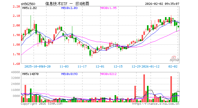 2月2日,信息技术ETF(562560)开盘跌0.30%,报1.993元。信息技术ETF(562560)重仓股方面,立讯精密开盘涨0.58%,寒武纪跌0.79%,工业富联跌1.56%,中芯国际跌1.28%,海光信息跌1.68%,北方华创跌0.75%,胜宏科技涨1.22%,京东方A跌1.14%,兆易创新跌4.47%,澜起科技跌0.47%。