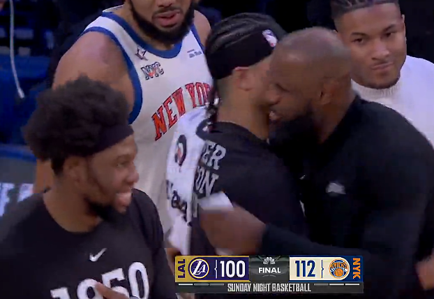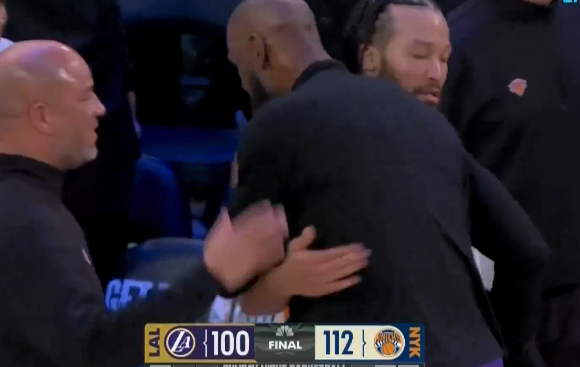 詹姆斯赛后和布伦森、哈特、唐斯及尼克斯全队拥抱致意。