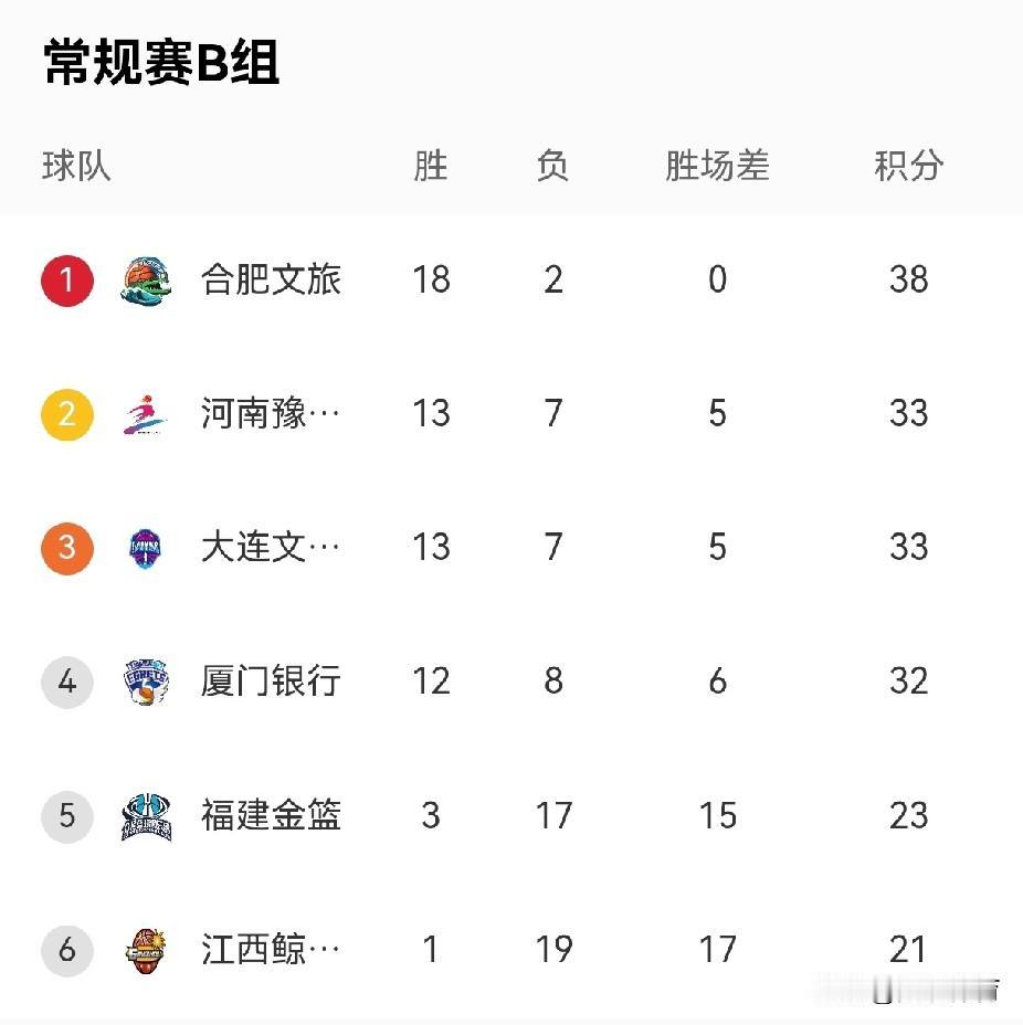 中国女子篮球职业联赛积分榜(常规赛) 常规赛A组: 排名/球队/ 胜 负 /胜场差/ 积分 1山西竹叶青酒18 4 0 40 2东莞新彤盛17 5 1 39 3四川蜀道远达17 5 1 39 4新疆天山14 8 4 36 5山东赤水河酒14 8 4 36 6上海浦发银行13 9 5 35 7江苏南钢12 10 6 34 8武汉盛帆黄鹤10 12 8 32 9石家庄英励7 15 11 29 10北京首钢园6 16 12 28 11陕西榆林天泽2 20 16 24 12浙江稠州银行2 20 16 24 常规赛B组: 球队 胜 负 胜场差 积分 1合肥文旅18 2 0 38 2河南豫光金铅13 7 5 33 3大连文体旅13 7 5 33 4厦门银行12 8 6 32 5福建金篮3 17 15 23 6江西鲸裕清酒1 19 17 21