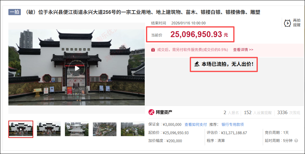 近日,位于湖南郴州市永兴县的地标建筑“永兴银楼”被拍卖。目前拍卖已结束,起拍价为2509多万元,显示已流拍。本次拍卖于1月16日进行,有两人报名,但始终无人出价。