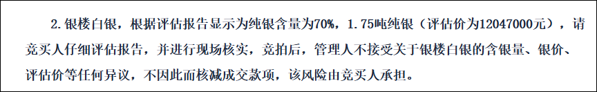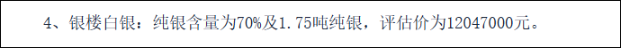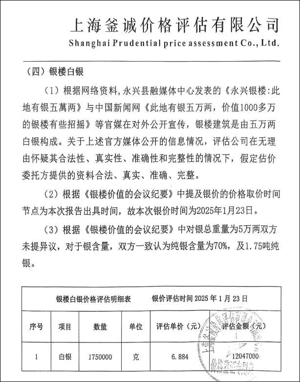 湖南鑫达上传平台的一份价格评估报告书还称,根据永兴县融媒体中心发表的《永兴银楼:此地有银五萬两》与中国新闻网《此地有银五万两,价值1000多万的银楼有些招摇》等媒体在对外公开宣传,银楼建筑是由5万两白银构成。评估报告书称还称,根据《银楼价值的会议纪要》,本次银价取价时间为2025年1月23日。对银总重量为5万两未提异议,对于银含量一致认为纯银含量为70%,即5万两(2.5吨)银中含纯银1.75吨,评估单价为纯银6.884元/克。