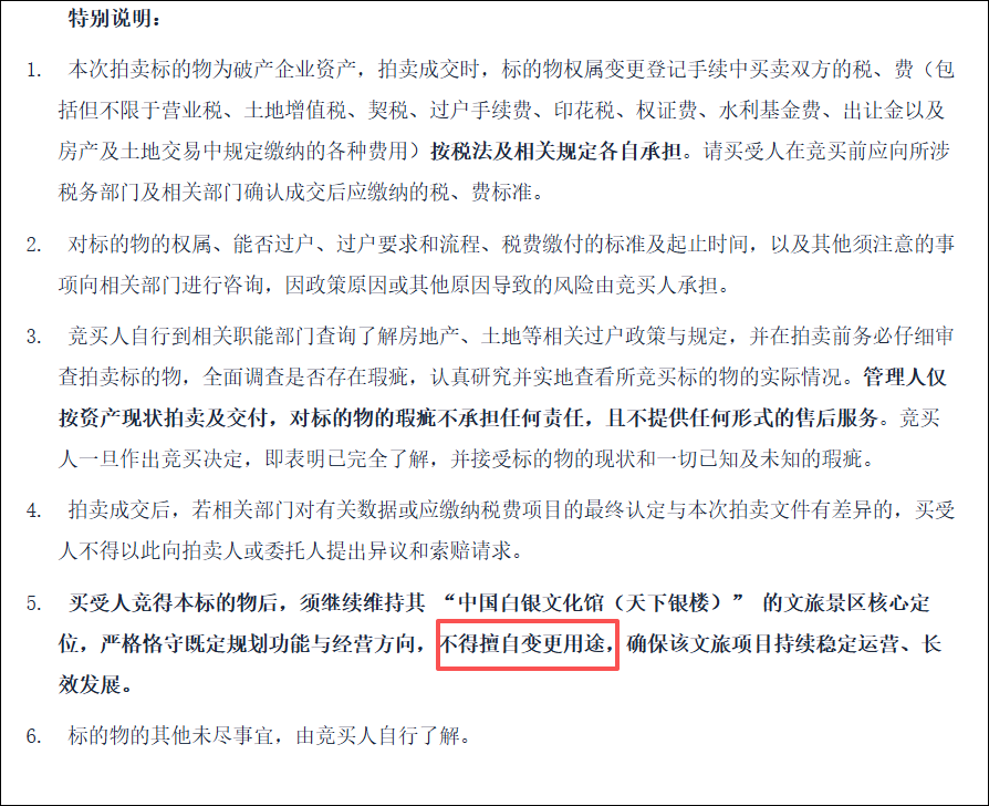 永兴银楼拍卖公告中有6条特别说明,其中第5条称:买受人竞得本标的物后,须继续维持其“中国白银文化馆(天下银楼)”的文旅景区核心定位,严格恪守既定规划功能与经营方向,不得擅自变更用途,确保该文旅项目持续稳定运营、长效发展。