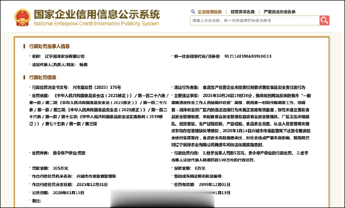 国家企业信用信息公示系统近日公开的行政处罚决定书显示,辽宁润泽农业有限公司因未按责任制要求落实食品安全责任的行为,被兴城市市场监督管理局罚款5万元并责令停产停业,法定代表人杨某被罚款100万元。