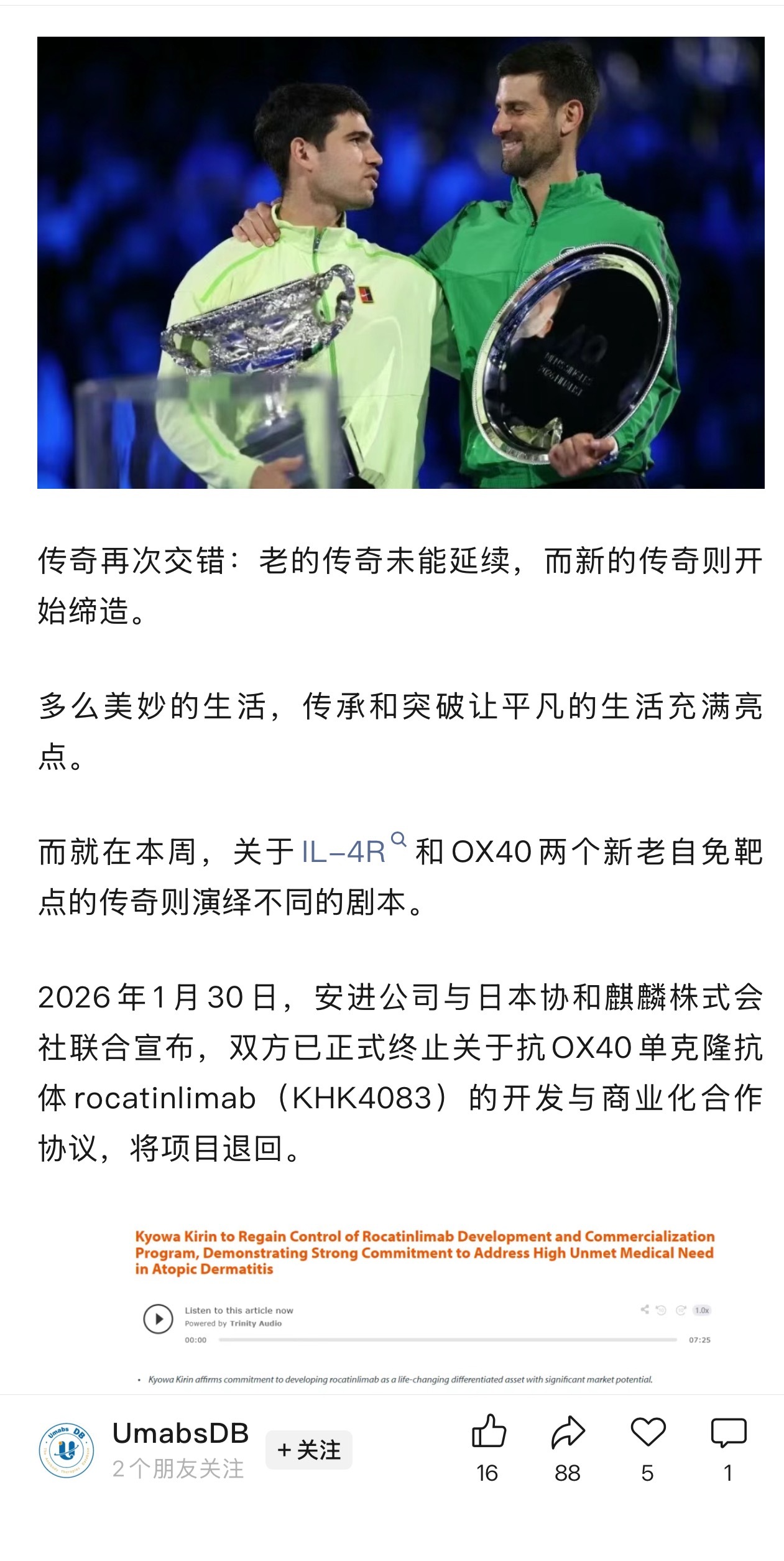 朋友圈看到,医药行业的权威公众号,昨天的推送都强行拿澳网决赛做标题和开头!