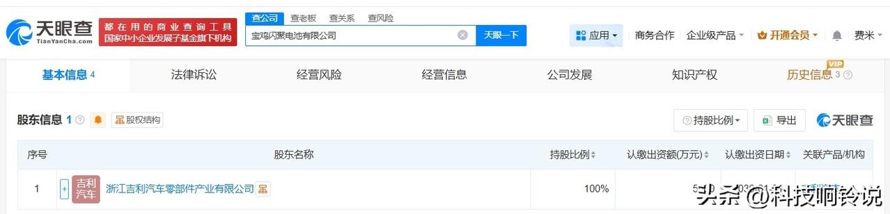 【吉利汽车在宝鸡成立闪聚电池公司 注册资本5000万】 天眼查App显示,近日,宝鸡闪聚电池有限公司成立,法定代表人为任向飞,注册资本5000万人民币,经营范围包括电池制造、电池销售、电池零配件生产、电容器及其配套设备制造等。股东信息显示,该公司由浙江吉利汽车零部件产业有限公司全资持股。 天眼查信息: