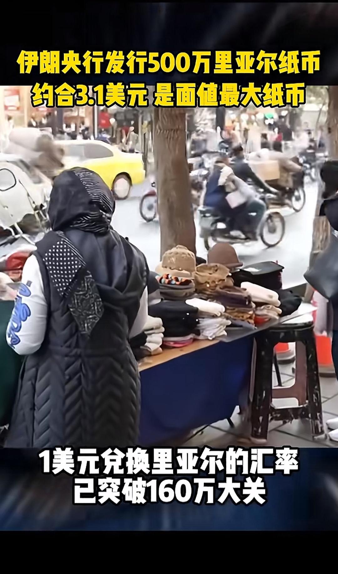 伊朗央行开始印制发行500万元的钞票,货币贬值如脱缰野马不可控制,国家经济与人民生活陷入更大的混乱。 美元与里亚尔的汇率已突破1:160万,这500万的里亚尔纸钞仅值3.1美元,这还是昨天、前天的排价,而且能不能兑换还是个问题。 想起1948年国民党金圆券改革失败,民众背一口袋钞票换不来一口袋粮食。