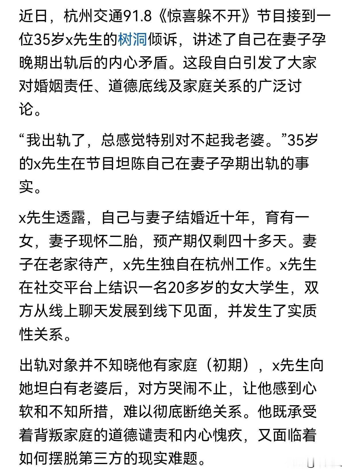 “既要又要,哪有这样的好事!”浙江杭州,妻子怀2胎,回了老家待产,男子独自在外面上班,却在网上认识了一名女大学生,两人相谈甚欢,相约线下见面后,还发生了关系,事后男子跟女子坦白自己有家庭,对方哭闹不止,男子反而说自己不知道怎么做了,他接下来的举动让人不可思议。 X先生和妻子结婚10年,婚后育有一个女儿,夫妻感情还算融洽,如今妻子怀了2胎,距离预产期仅剩40多天。 为了能让丈夫安心工作,妻子挺着大肚子,带着女儿回到老家待产,把生活的重担默默扛起,留下X先生独自在杭州打拼。 闲来无事,X先生在社交平台上结识了一位20多岁的女大学生,两人话题投机,常常互相倾诉生活中的烦恼。 女大学生很善解人意,经常对x先生嘘寒问暖,一来二去,两人互有好感,从线上发展为线下见面,感情迅速升温,浓情蜜意时,两人突破道德底线,发生了关系。 可事后,X先生的内心越来越纠结,自己是有老婆孩子的,并且妻子怀着二胎,就快就要生产了,自己这个时候出轨,实在是对不起老婆孩子。 他不得不向出轨对象坦白了自己有家庭的事实,并希望跟对方分手,可没想到对方却哭闹不止,坚决不同意分手。 X先生心软了,难以狠下心与对方断绝关系,妻子总是打电话向他要钱,这让他烦不胜烦,可出轨对象却对他满脸的崇拜,还拿奖学金给他买礼物。 一时之间,他陷入了两难的境地,不知该如何抉择。 无奈之下,X先生将自己的这段经历倾诉到了一档广播节目,他的自白引发了网友的热议。 有人说男人出轨总爱给自己找理由,说外面的女人懂事,能共情他,可他也不想想,外面的女人只需要陪他花前月下,风花雪月,没有柴米油盐酱醋茶的生活苦恼。 也有人说,这个男人说白了,就是既要又要,他并非真心愧疚,是喜欢小三了, 断不了,理智又觉得自己很渣,因为老婆孕期,怕老婆知道了要来闹,所以很苦恼,既想着老婆不闹,又能怀抱小三,这天底下哪有这样的好事。 1、X先生的出轨行为违背了夫妻忠实义务,是不道德的。 《民法典》第1043条规定:夫妻应当互相忠实,互相尊重,互相关爱。 婚姻是建立在忠诚、信任和责任基础之上的,妻子在孕期,本是最需要丈夫关心和陪伴的时候,她独自带着女儿回老家待产,忍受着身体的不适和生产的恐惧,X先生却在此时出轨,与女大学生发展不正当关系,这种行为违背了夫妻忠实义务,违背了公序良俗,理应受到谴责。 女大学生的行为同样违背了公序良俗,是不道德的。 《民法典》第8条规定:民事主体从事民事活动,不得违反法律,不得违背公序良俗。 一开始x先生并未把自己已婚的事实告知给女大学生,女大学生也是受害者。 可她后来明知对方有家庭,并且对方妻子正处于孕期,却依然介入他人婚姻,哭闹着不肯分手,这种行为不仅伤害了X先生的妻子和家庭,也破坏了公序良俗,同样应该受到谴责。 2、妻子怀孕期间,x先生不能提出离婚。 《民法典》第1082条规定:女方在怀孕期间、分娩后一年内或者终止妊娠后六个月内,男方不得提出离婚。但是,女方提出离婚或者法院认为确有必要受理男方离婚请求的除外。 妻子怀孕,这个时间段x先生是不可以跟妻子离婚的,但是如果妻子发现两人的丑事,主动权在妻子手中,妻子可以提出离婚。 目前来说,x先生应该做的,是跟出轨对象断绝关系,两人不再来往,好好陪伴妻子,回归家庭。 婚姻不是儿戏,结婚意味着责任和担当,每个人都应该遵守道德底线,忠诚于另一半,不要因一时的新鲜毁掉原本幸福的家庭。