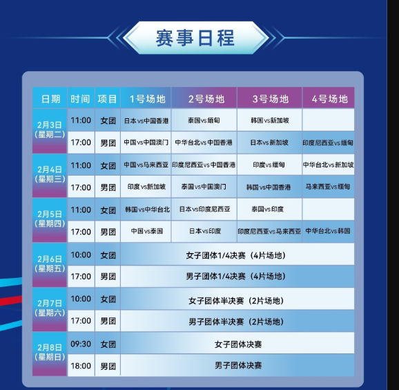 虎扑02月02日讯2026年亚洲羽毛球团体锦标赛将于明日在青岛国信体育馆正式开赛,东道主中国羽毛球队由奥运冠军贾一凡领衔出战。赛程方面,中国男团作为卫冕冠军,2月3日对阵中国澳门,2月5日迎战泰国;中国女团作为头号种子,2月4日战小组赛唯一对手马来西亚。
