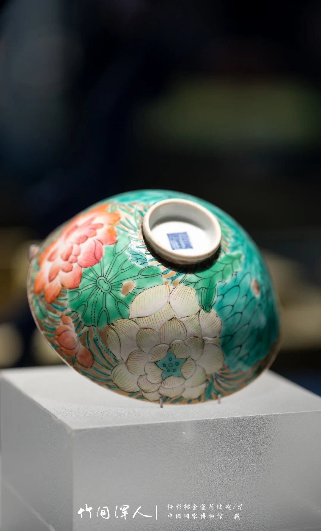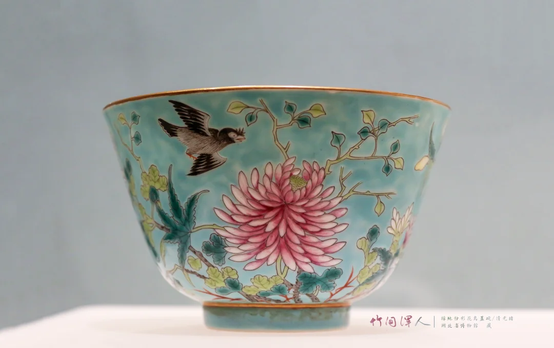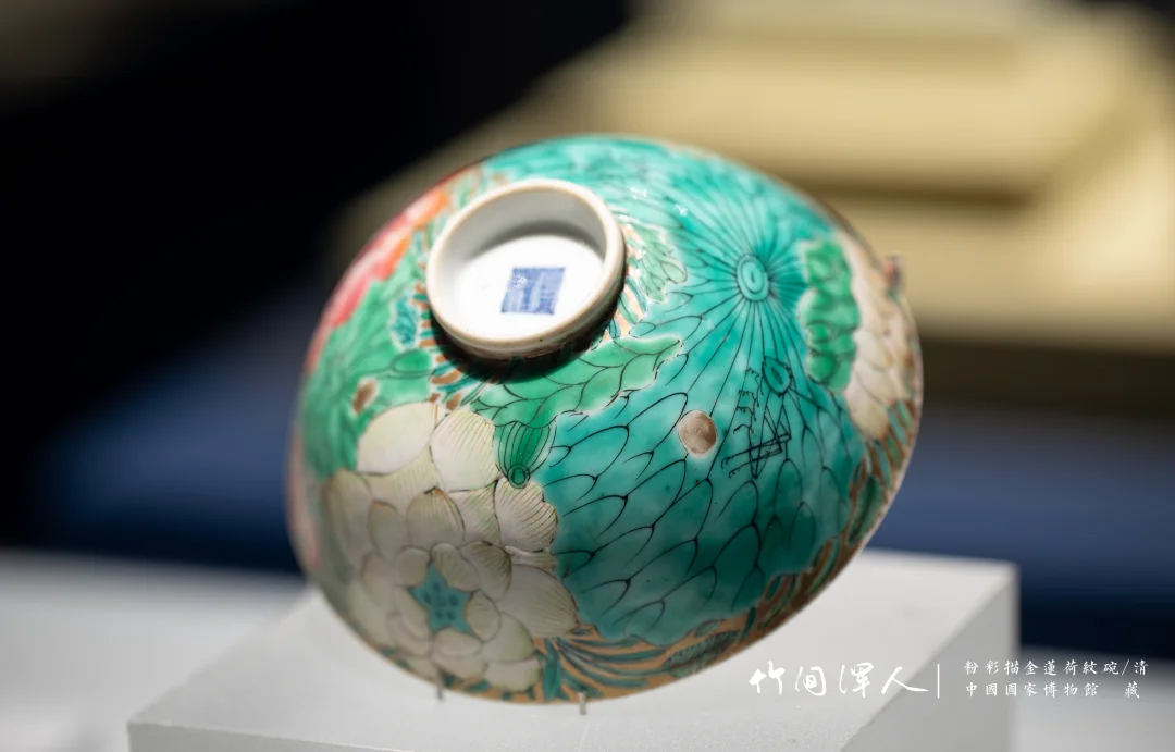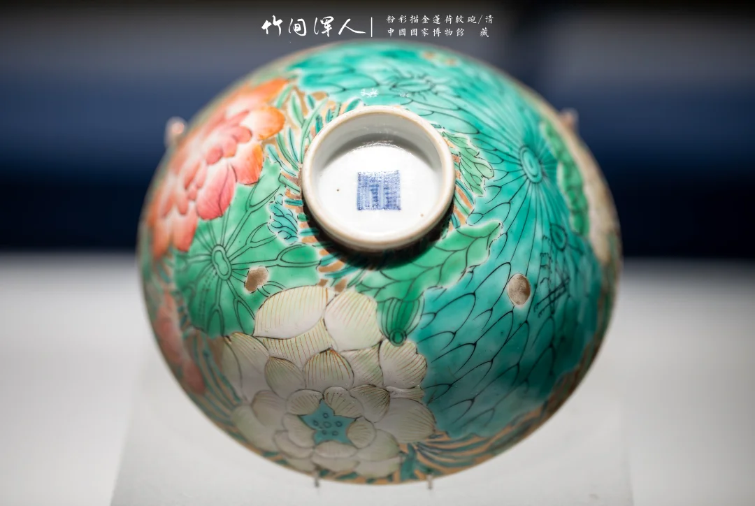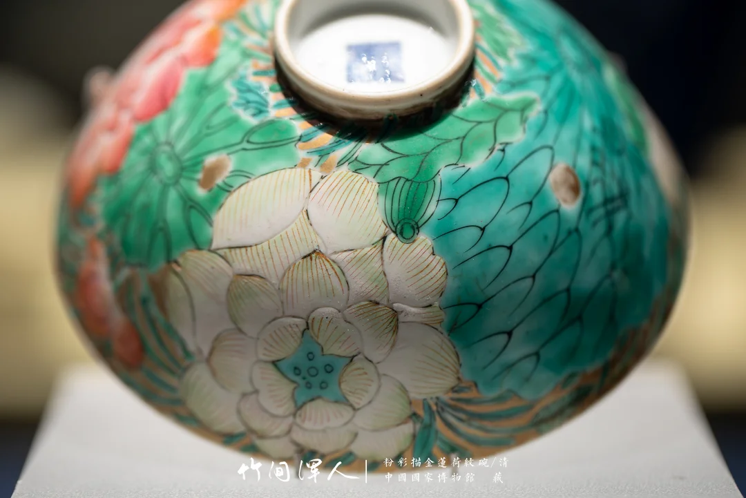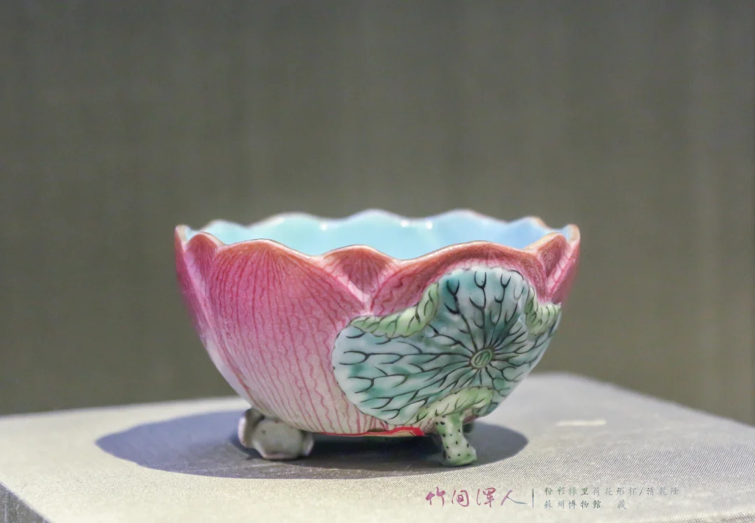 (3)红绿色内部有明度变化,秋操杯是大片的死亡粉色花瓣,但因为花瓣内部有色彩变化就显得很有层次,不俗。类似的记得杭州市博物馆有一件青花釉里红的荷花碗,花瓣边上可能因为温度高,釉里红烧飞了一点,反而更加自然