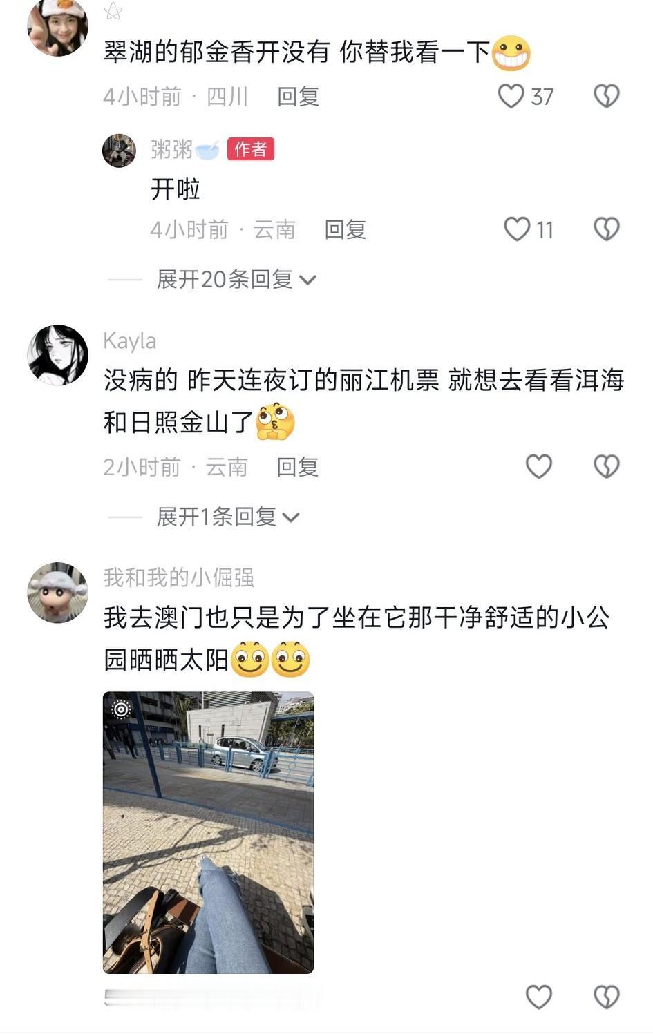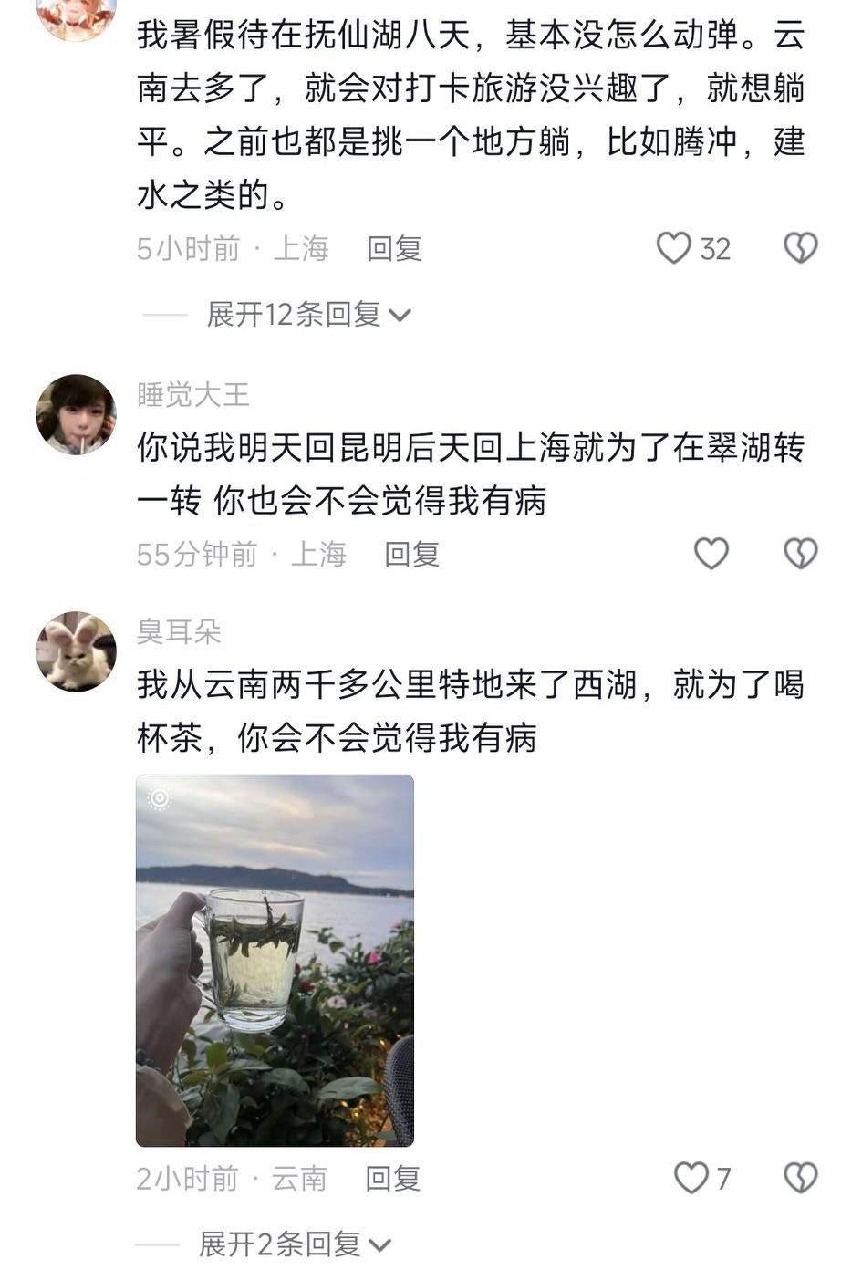 有个苏州人说:我从苏州两千多公里,特地来昆明翠湖,就是为了抽根烟、晒太阳、喝茶、发呆,你会不会觉得我有病? 评论区很多人晒出他们的行程,有去西湖边喝茶的,有去哈尔滨看雪的,有去看日照金山的。 在城里待久了,总想亲近大自然,想晒晒太阳,给自己冲点能量,回到城市继续打拼!